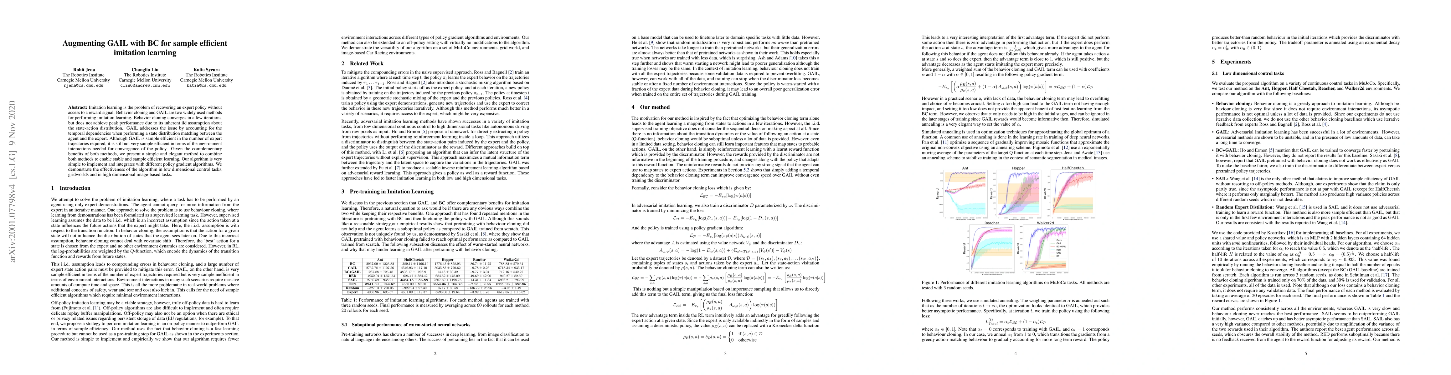 Researchers improved imitation learning by combining behavior cloning and GAIL to create a more efficient method for agents to learn from expert demonstrations, achieving stable and sample-efficient learning in various tasks.