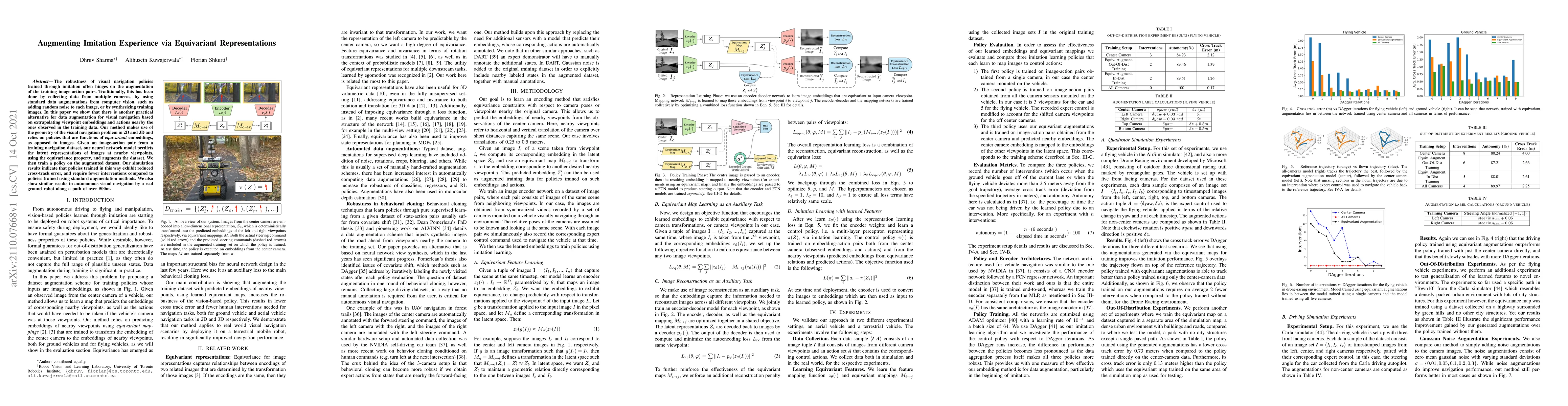 The robustness of visual navigation policies trained through imitation often hinges on the augmentation of the training image-action pairs. Traditionally, this has been done by collecting data from multiple cameras, by using standard data augmentations from computer vision, such as adding random noise to each image, or by synthesizing training images. In this paper we show that there is another practical alternative for data augmentation for visual navigation based on extrapolating viewpoint embeddings and actions nearby the ones observed in the training data. Our method makes use of the geometry of the visual navigation problem in 2D and 3D and relies on policies that are functions of equivariant embeddings, as opposed to images. Given an image-action pair from a training navigation dataset, our neural network model predicts the latent representations of images at nearby viewpoints, using the equivariance property, and augments the dataset. We then train a policy on the augmented dataset. Our simulation results indicate that policies trained in this way exhibit reduced cross-track error, and require fewer interventions compared to policies trained using standard augmentation methods. We also show similar results in autonomous visual navigation by a real ground robot along a path of over 500m.