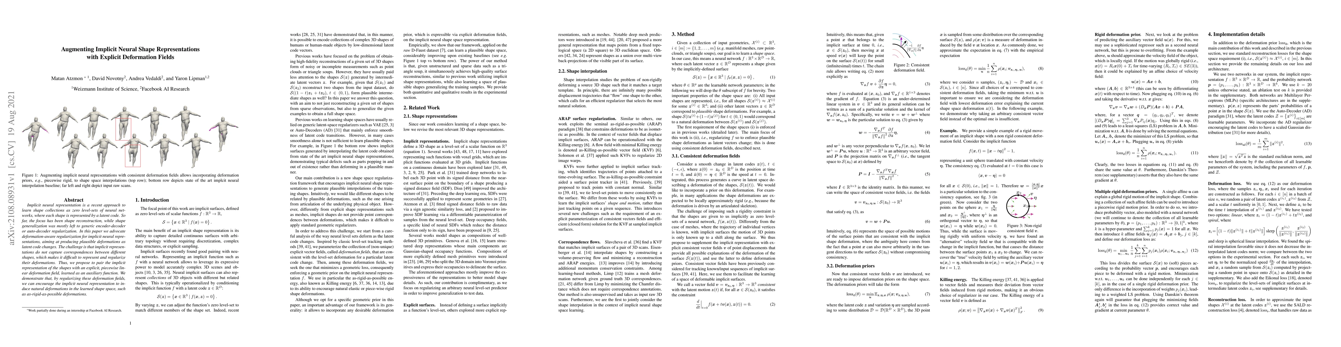 This paper proposes augmenting implicit neural representations of shapes with explicit deformation fields to facilitate natural shape deformations. By incorporating an auxiliary piecewise linear deformation field, the method aims to regularize shape transformations, leading to more plausible and as-rigid-as-possible deformations.