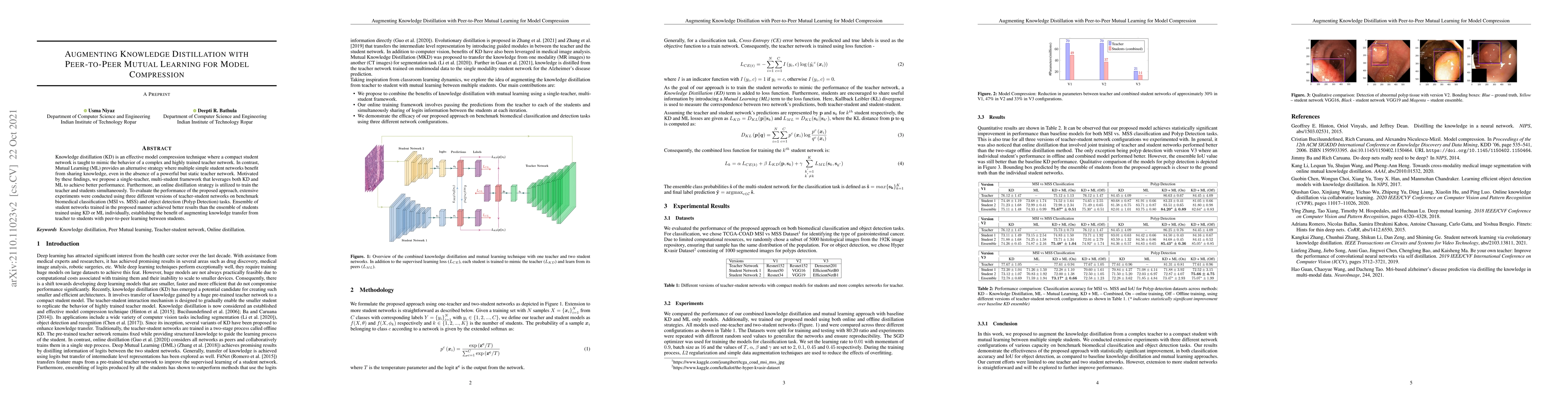 This paper proposes a framework combining knowledge distillation and mutual learning for model compression, achieving better performance through simultaneous training of a teacher network and multiple student networks. Experiments on biomedical classification and object detection tasks show that the ensemble of student networks benefits from both teacher-student and peer-to-peer knowledge transfer.