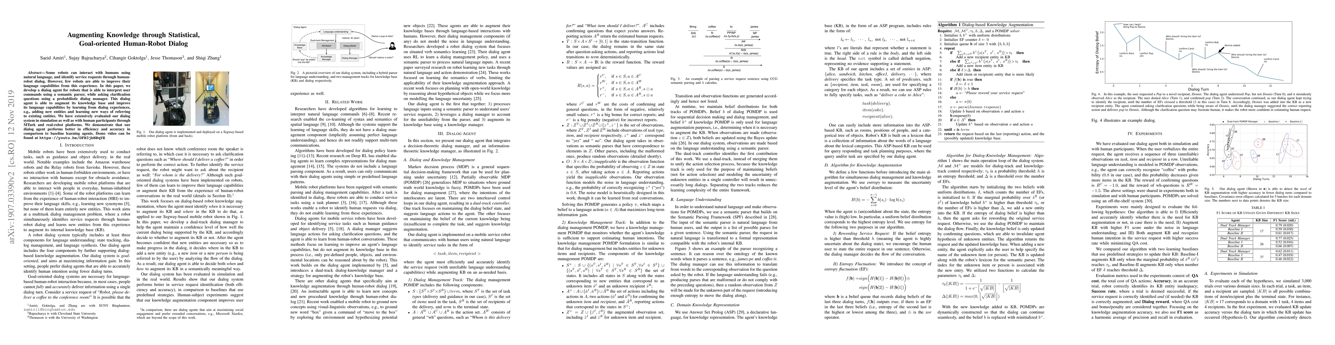 Some robots can interact with humans using natural language, and identify service requests through human-robot dialog. However, few robots are able to improve their language capabilities from this experience. In this paper, we develop a dialog agent for robots that is able to interpret user commands using a semantic parser, while asking clarification questions using a probabilistic dialog manager. This dialog agent is able to augment its knowledge base and improve its language capabilities by learning from dialog experiences, e.g., adding new entities and learning new ways of referring to existing entities. We have extensively evaluated our dialog system in simulation as well as with human participants through MTurk and real-robot platforms. We demonstrate that our dialog agent performs better in efficiency and accuracy in comparison to baseline learning agents. Demo video can be found at https://youtu.be/DFB3jbHBqYE