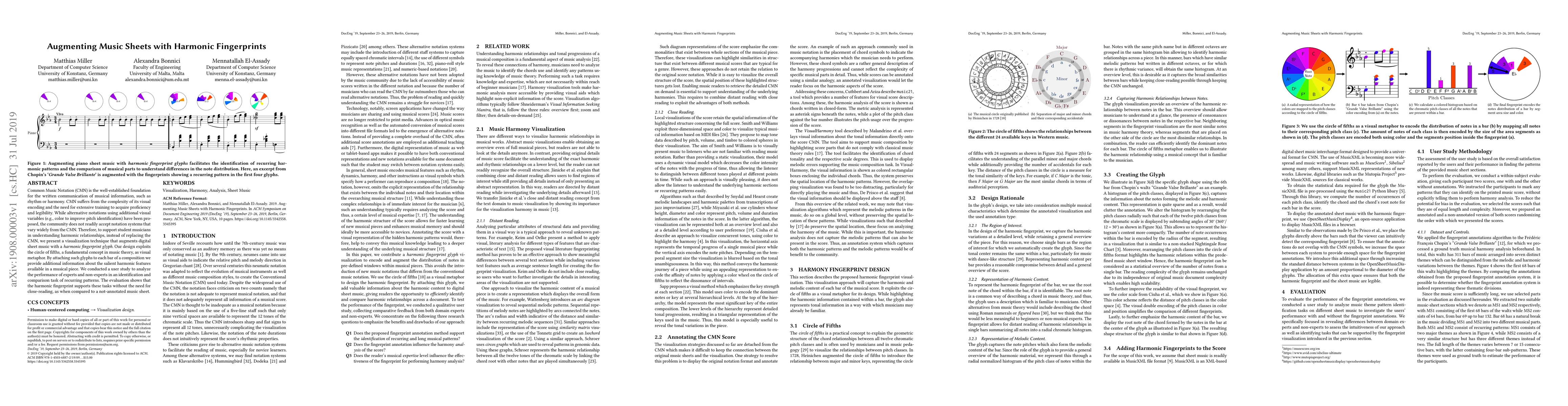 Conventional Music Notation (CMN) is the well-established foundation for the written communication of musical information, such as rhythm, harmony, or timbre. However, CMN suffers from the complexity of its visual encoding and the need for extensive training to acquire proficiency and legibility. While alternative notations using additional visual variables (such as color to improve pitch identification) have been proposed, the music community does not readily accept notation systems that vary widely from the CMN. Therefore, to support student musicians in understanding the harmonic relationship of notes, instead of replacing the CMN, we present a visualization technique that augments a digital music sheet with a harmonic fingerprint glyph. Our design exploits the circle of fifths - a fundamental concept in music theory, as a visual metaphor. By attaching these visual glyphs to each bar of a selected composition we provide additional information about the salient harmonic features available in a musical piece. We conducted a user study to analyze the performance of experts and non-experts in an identification and comparison task of recurring patterns. The evaluation shows that the harmonic fingerprint supports these tasks without the need for close-reading, as when compared to a not-annotated music sheet.
