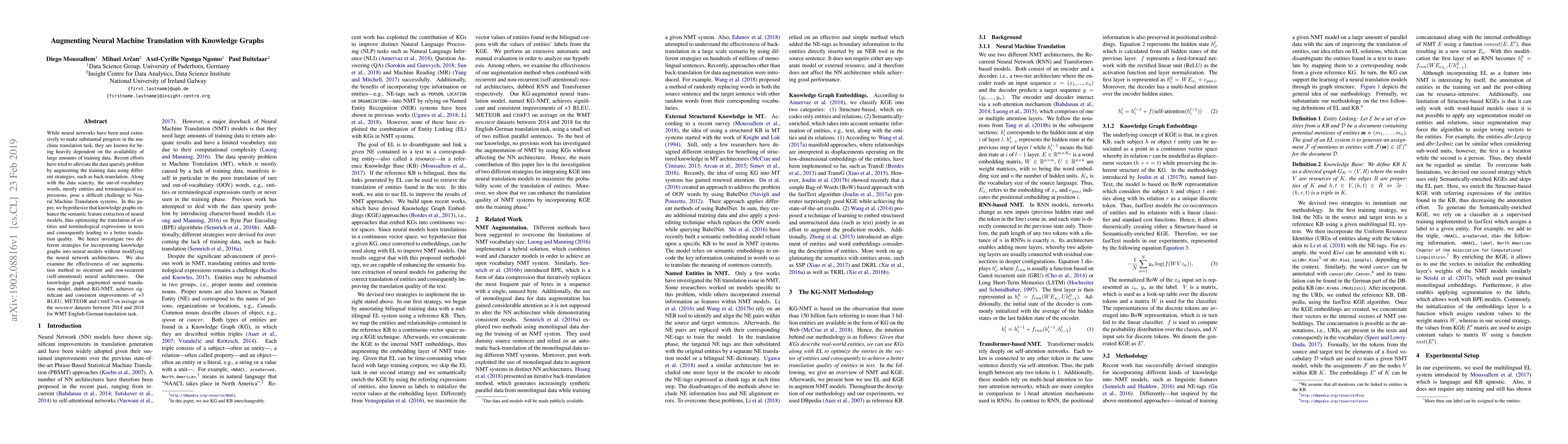 This paper explores augmenting neural machine translation with knowledge graphs to address data sparsity and out-of-vocabulary issues, achieving notable improvements in translation quality across various metrics. The proposed KG-NMT model integrates knowledge graphs into neural architectures without altering them, demonstrating consistent enhancements in the WMT English-German translation task.