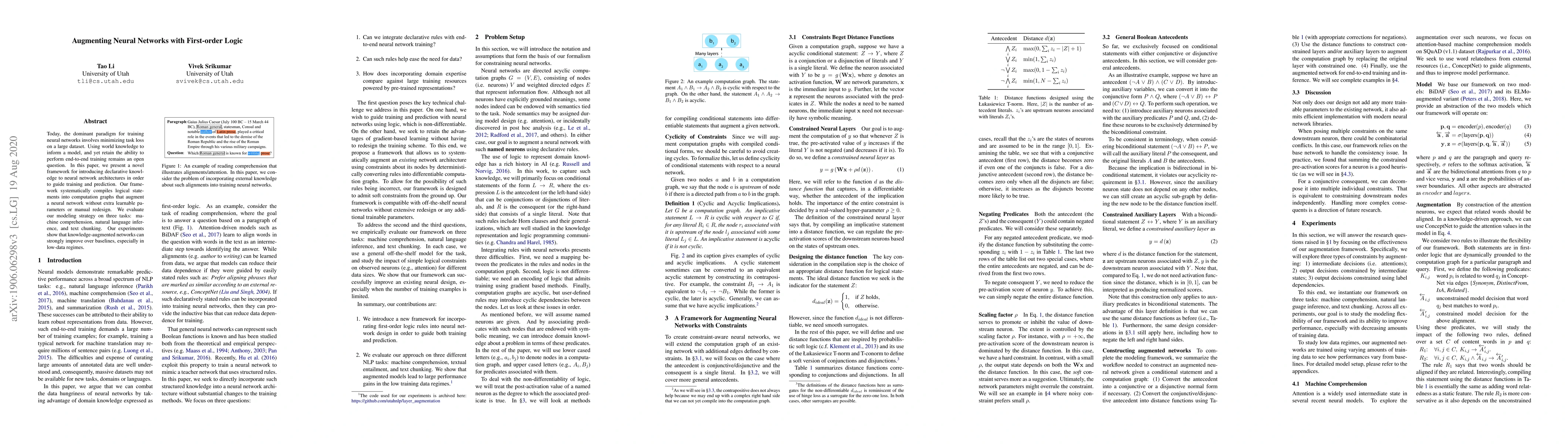 Today, the dominant paradigm for training neural networks involves minimizing task loss on a large dataset. Using world knowledge to inform a model, and yet retain the ability to perform end-to-end training remains an open question. In this paper, we present a novel framework for introducing declarative knowledge to neural network architectures in order to guide training and prediction. Our framework systematically compiles logical statements into computation graphs that augment a neural network without extra learnable parameters or manual redesign. We evaluate our modeling strategy on three tasks: machine comprehension, natural language inference, and text chunking. Our experiments show that knowledge-augmented networks can strongly improve over baselines, especially in low-data regimes.