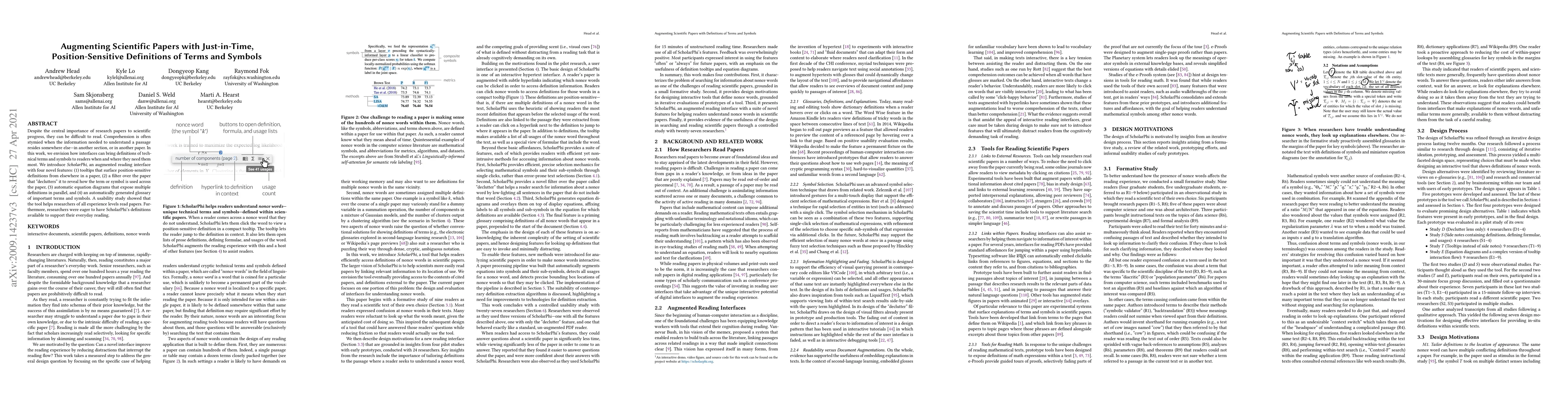 Despite the central importance of research papers to scientific progress, they can be difficult to read. Comprehension is often stymied when the information needed to understand a passage resides somewhere else: in another section, or in another paper. In this work, we envision how interfaces can bring definitions of technical terms and symbols to readers when and where they need them most. We introduce ScholarPhi, an augmented reading interface with four novel features: (1) tooltips that surface position-sensitive definitions from elsewhere in a paper, (2) a filter over the paper that "declutters" it to reveal how the term or symbol is used across the paper, (3) automatic equation diagrams that expose multiple definitions in parallel, and (4) an automatically generated glossary of important terms and symbols. A usability study showed that the tool helps researchers of all experience levels read papers. Furthermore, researchers were eager to have ScholarPhi's definitions available to support their everyday reading.