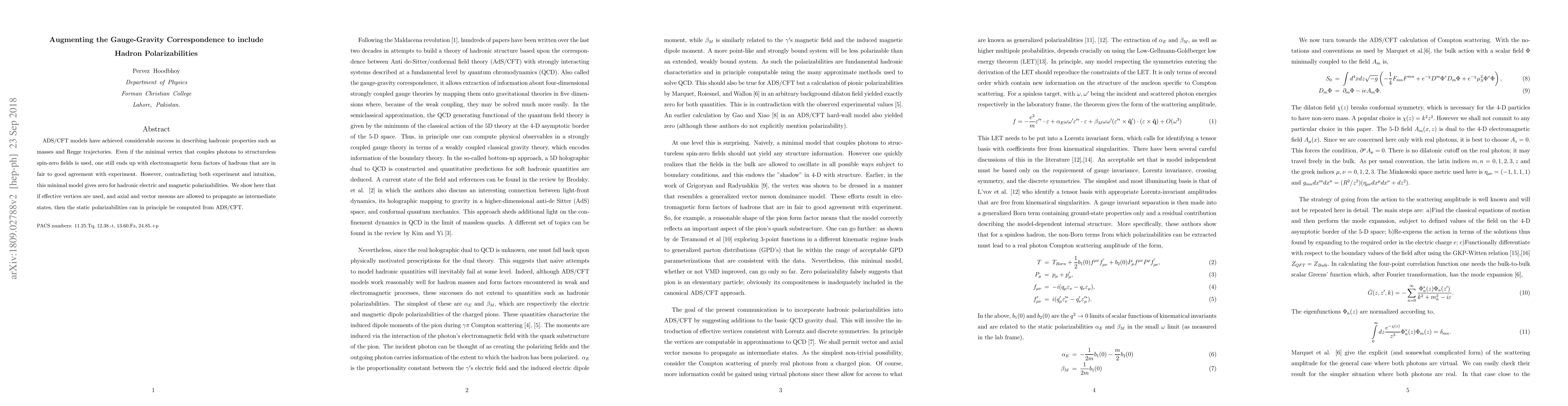 ADS/CFT models have achieved considerable success in describing hadronic properties such as masses and Regge trajectories. Even if the minimal vertex that couples photons to structureless spin-zero fields is used, one still ends up with electromagnetic form factors of hadrons that are in fair to good agreement with experiment. However, contradicting both experiment and intuition, this minimal model gives zero for hadronic electric and magnetic polarizabilities. We show here that if effective vertices are used, and axial and vector mesons are allowed to propagate as intermediate states, then the static polarizabilities can in principle be computed from ADS/CFT.