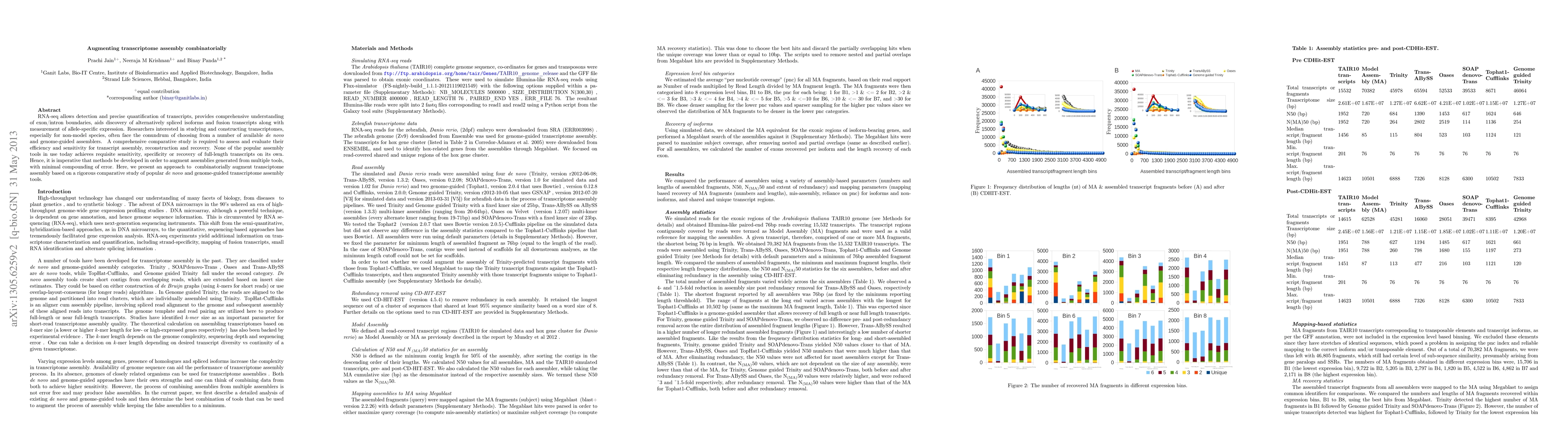 RNA-seq allows detection and precise quantification of transcripts, provides comprehensive understanding of exon/intron boundaries, aids discovery of alternatively spliced isoforms and fusion transcripts along with measurement of allele-specific expression. Researchers interested in studying and constructing transcriptomes, especially for non-model species, often face the conundrum of choosing from a number of available de novo and genome-guided assemblers. A comprehensive comparative study is required to assess and evaluate their efficiency and sensitivity for transcript assembly, reconstruction and recovery. None of the popular assembly tools in use today achieves requisite sensitivity, specificity or recovery of full-length transcripts on its own. Hence, it is imperative that methods be developed in order to augment assemblies generated from multiple tools, with minimal compounding of error. Here, we present an approach to combinatorially augment transciptome assembly based on a rigorous comparative study of popular de novo and genome-guided transcriptome assembly tools.