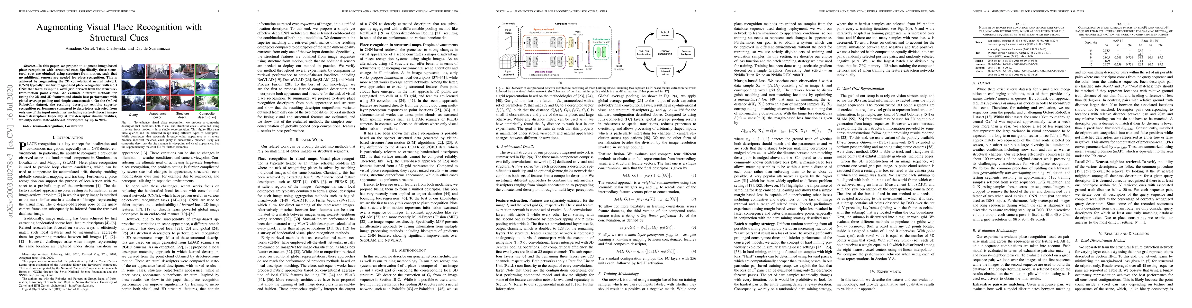 In this paper, we propose to augment image-based place recognition with structural cues. Specifically, these structural cues are obtained using structure-from-motion, such that no additional sensors are needed for place recognition. This is achieved by augmenting the 2D convolutional neural network (CNN) typically used for image-based place recognition with a 3D CNN that takes as input a voxel grid derived from the structure-from-motion point cloud. We evaluate different methods for fusing the 2D and 3D features and obtain best performance with global average pooling and simple concatenation. On the Oxford RobotCar dataset, the resulting descriptor exhibits superior recognition performance compared to descriptors extracted from only one of the input modalities, including state-of-the-art image-based descriptors. Especially at low descriptor dimensionalities, we outperform state-of-the-art descriptors by up to 90%.