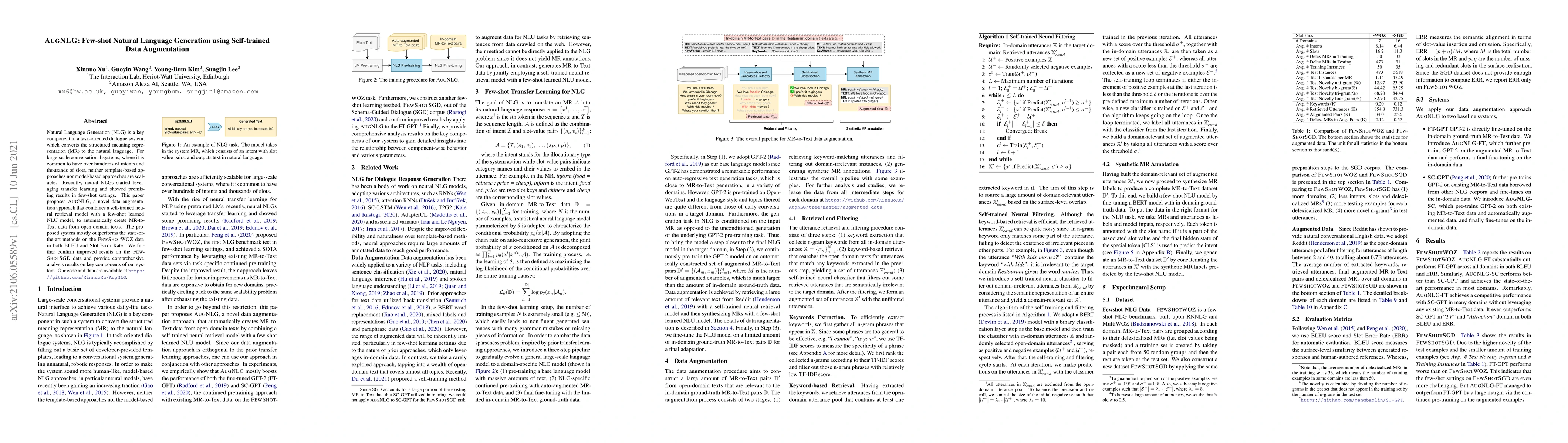 This paper introduces AUGNLG, a data augmentation technique for few-shot Natural Language Generation (NLG) that combines self-trained neural retrieval with few-shot learning, achieving superior performance on the FewShotWOZ and FewShotSGD datasets. The system outperforms state-of-the-art methods in BLEU and Slot Error Rate metrics.