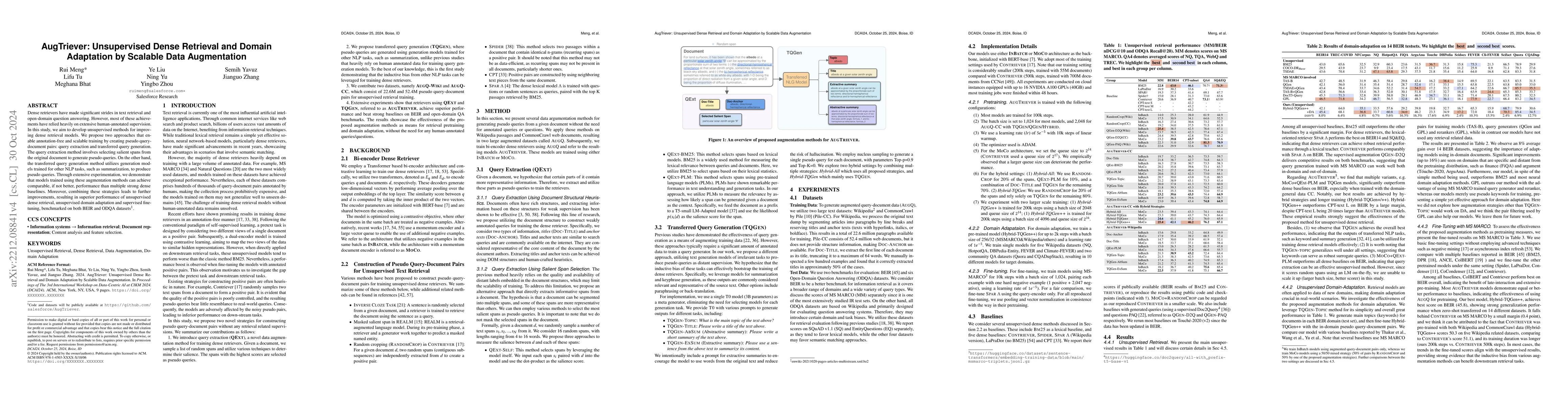 Title: AugTriever: Unsupervised Dense Retrieval by Scalable Data Augmentation Summary: This paper proposes two unsupervised methods for dense text retrieval, leveraging data augmentation to create pseudo query-document pairs without human annotation, achieving state-of-the-art performance on BEIR and ODQA datasets.
