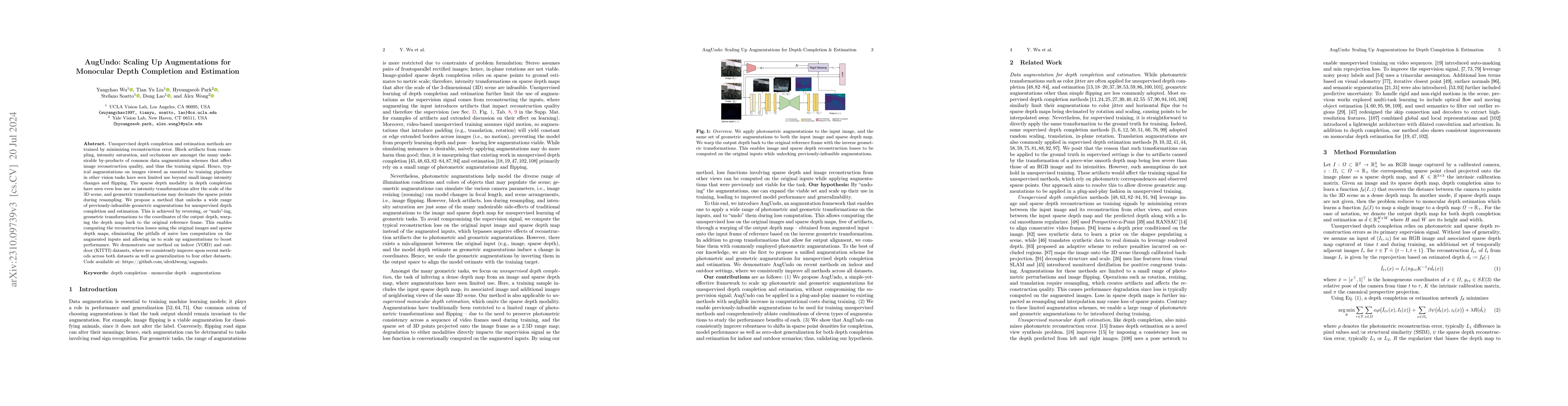 The paper introduces AugUndo, a method to enable effective geometric augmentations for unsupervised depth completion by undoing transformations on the output depth map, thus improving performance by an average of 11.75% on indoor and outdoor datasets. This approach enhances training by mitigating the artifacts from common augmentations.
