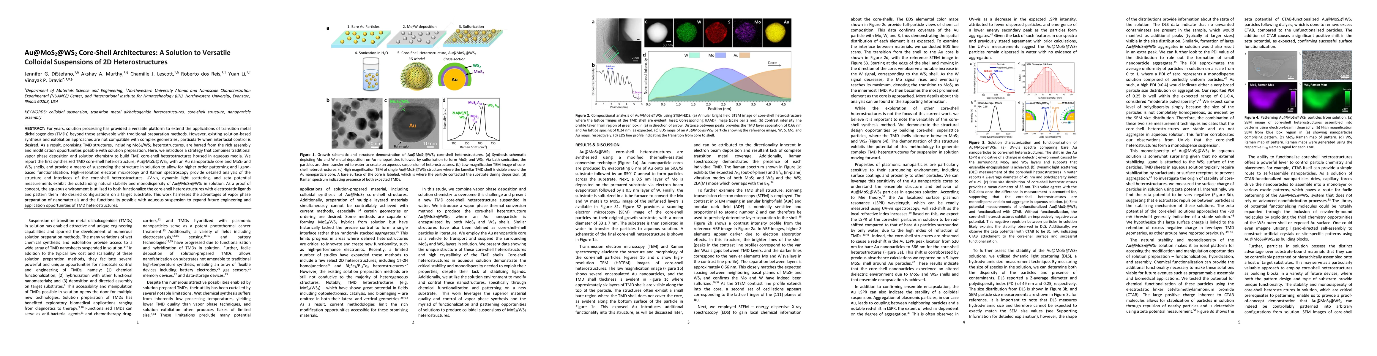 This paper presents a novel synthesis strategy combining vapor phase deposition and solution chemistry to create Au@MoS2@WS2 core-shell heterostructures, enabling versatile colloidal suspensions in aqueous media. The method allows for high-order patterning and functionalization, expanding the engineering and application possibilities of transition metal dichalcogenide heterostructures.
