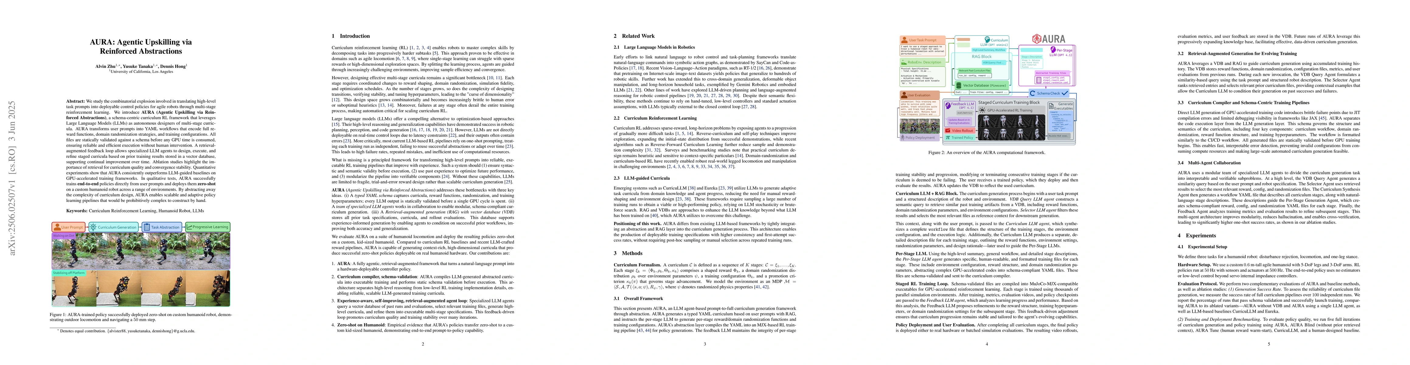 We study the combinatorial explosion involved in translating high-level task prompts into deployable control policies for agile robots through multi-stage reinforcement learning. We introduce AURA (Agentic Upskilling via Reinforced Abstractions), a schema-centric curriculum RL framework that leverages Large Language Models (LLMs) as autonomous designers of multi-stage curricula. AURA transforms user prompts into YAML workflows that encode full reward functions, domain randomization strategies, and training configurations. All files are statically validated against a schema before any GPU time is consumed, ensuring reliable and efficient execution without human intervention. A retrieval-augmented feedback loop allows specialized LLM agents to design, execute, and refine staged curricula based on prior training results stored in a vector database, supporting continual improvement over time. Ablation studies highlight the importance of retrieval for curriculum quality and convergence stability. Quantitative experiments show that AURA consistently outperforms LLM-guided baselines on GPU-accelerated training frameworks. In qualitative tests, AURA successfully trains end-to-end policies directly from user prompts and deploys them zero-shot on a custom humanoid robot across a range of environments. By abstracting away the complexity of curriculum design, AURA enables scalable and adaptive policy learning pipelines that would be prohibitively complex to construct by hand.