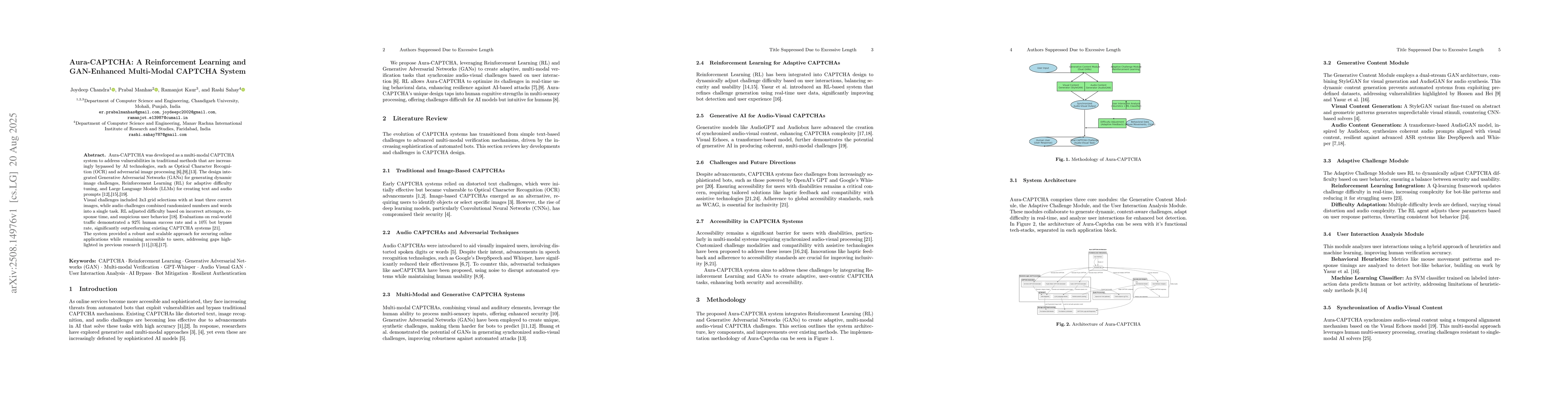 Aura-CAPTCHA was developed as a multi-modal CAPTCHA system to address vulnerabilities in traditional methods that are increasingly bypassed by AI technologies, such as Optical Character Recognition (OCR) and adversarial image processing. The design integrated Generative Adversarial Networks (GANs) for generating dynamic image challenges, Reinforcement Learning (RL) for adaptive difficulty tuning, and Large Language Models (LLMs) for creating text and audio prompts. Visual challenges included 3x3 grid selections with at least three correct images, while audio challenges combined randomized numbers and words into a single task. RL adjusted difficulty based on incorrect attempts, response time, and suspicious user behavior. Evaluations on real-world traffic demonstrated a 92% human success rate and a 10% bot bypass rate, significantly outperforming existing CAPTCHA systems. The system provided a robust and scalable approach for securing online applications while remaining accessible to users, addressing gaps highlighted in previous research.