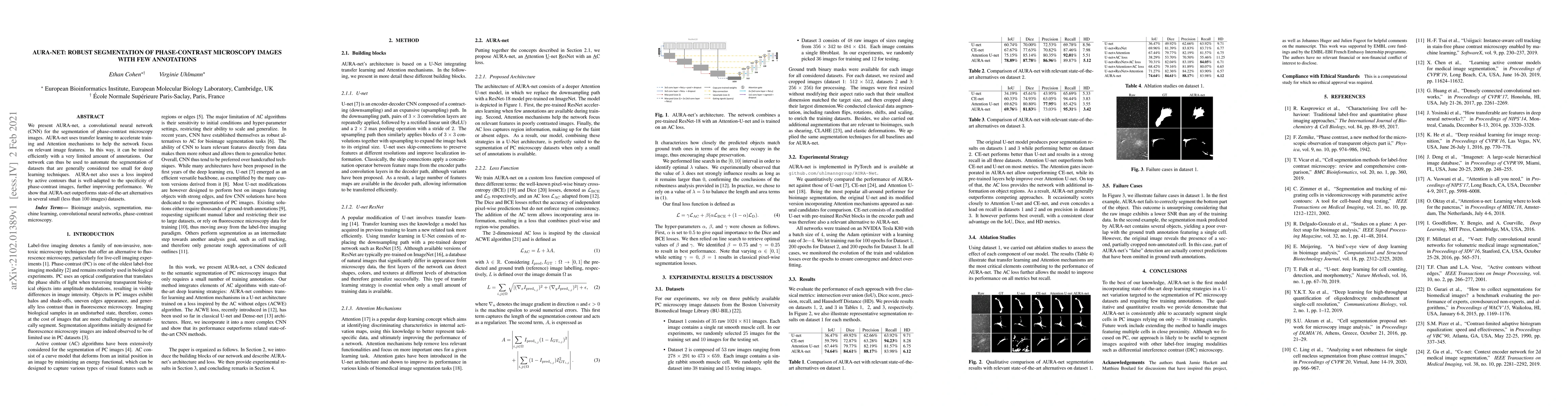 AURA-net is a deep learning model that automates the segmentation of phase-contrast microscopy images with minimal annotations, outperforming state-of-the-art alternatives in small datasets.