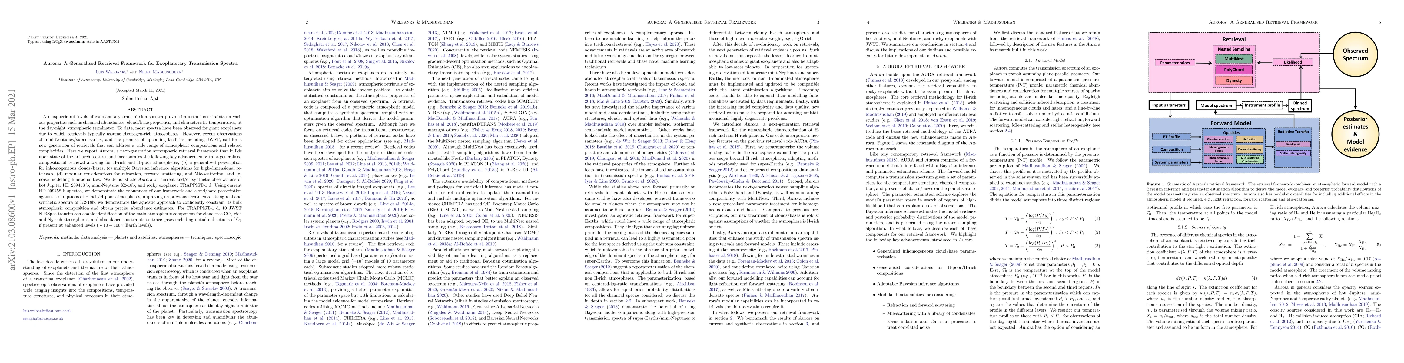 Aurora is a new atmospheric retrieval framework designed for exoplanetary transmission spectra, capable of handling diverse atmospheric compositions and complexities. It demonstrates improved robustness and precision in retrieving atmospheric properties for a range of exoplanets, including HD209458b, K218b, and TRAPPIST1d.