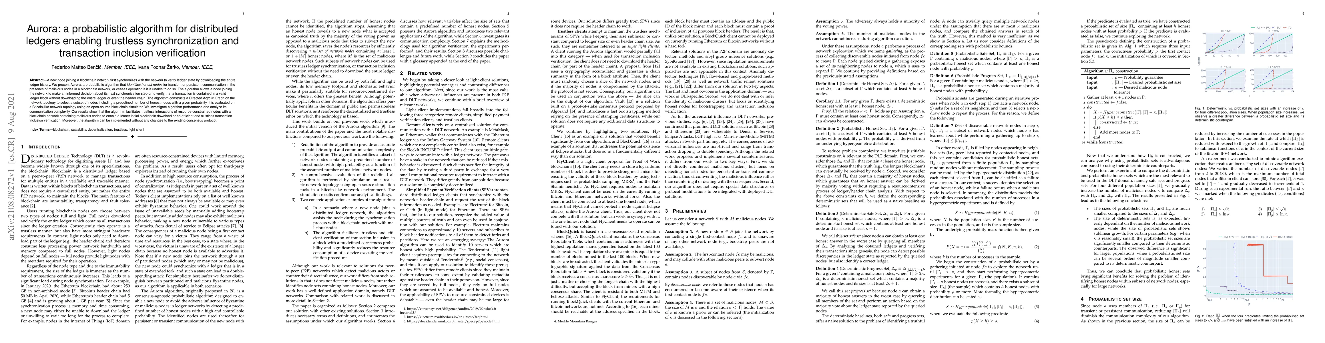 Aurora is a probabilistic algorithm designed to enable trustless synchronization and transaction verification in blockchain networks by identifying honest nodes without requiring full ledger downloads. It constructs a Directed Acyclic Graph to select a subset of nodes, facilitating efficient and secure interactions even in the presence of malicious nodes.