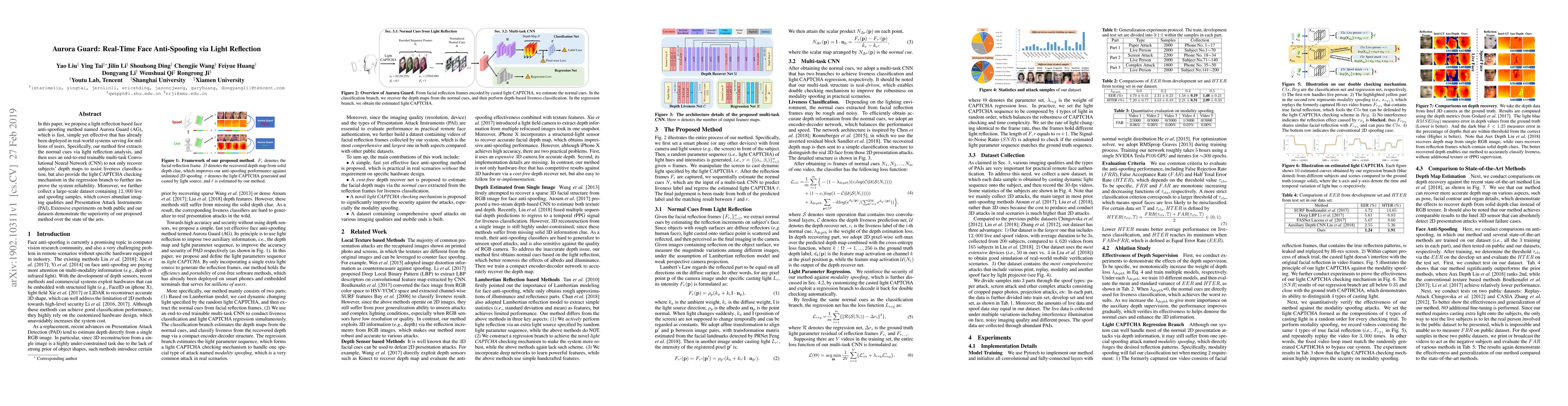 Aurora Guard is a real-time face anti-spoofing method utilizing light reflection analysis and an end-to-end CNN for depth map recovery and liveness classification, showing superior performance over existing methods. The method has been deployed in systems serving millions of users.