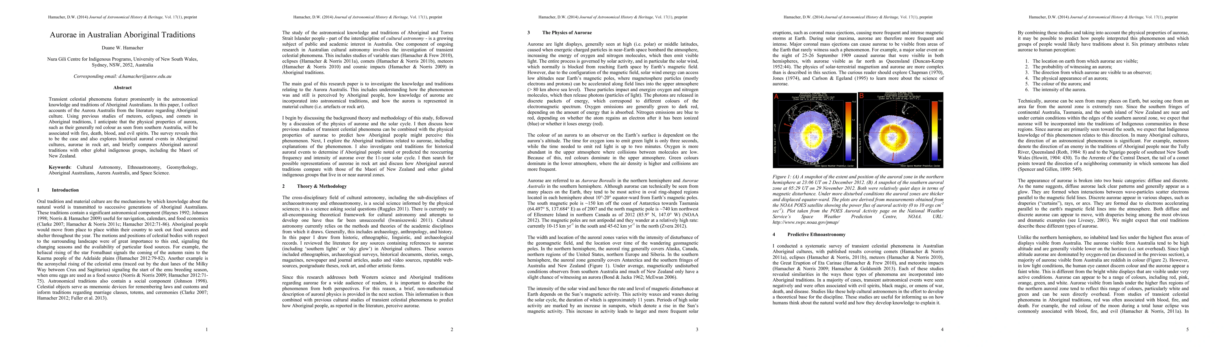 This paper compiles Aboriginal Australian accounts of the Aurora Australis, finding that they often associate its red color with fire, death, blood, and evil spirits. It also examines historical auroral events, their representation in rock art, and compares these traditions with those of other indigenous groups like the Maori.