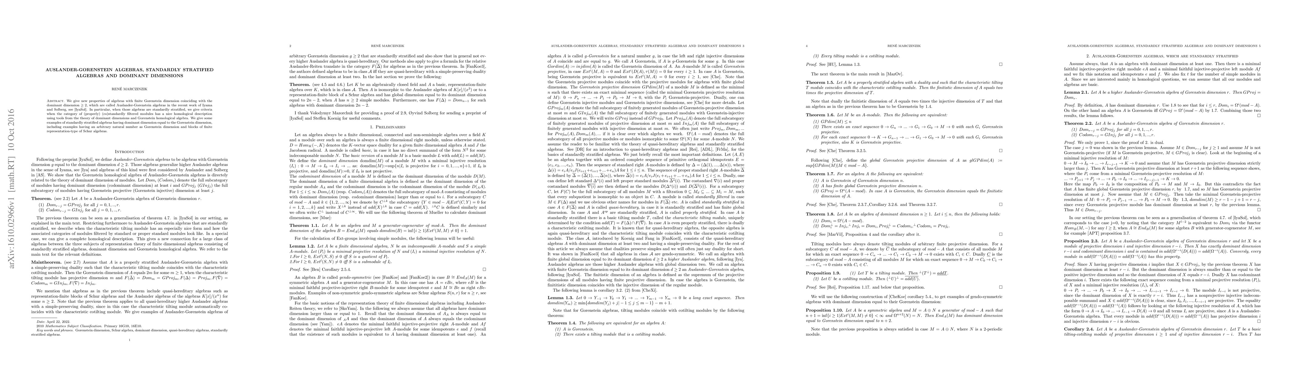 This paper explores Auslander-Gorenstein algebras, a class of algebras where the Gorenstein dimension equals dominant dimension $\geq 2$. It provides criteria for standardly stratified algebras whose module categories can be described using dominant dimensions and Gorenstein homological algebra, with examples showcasing various Gorenstein dimensions and representation-types.