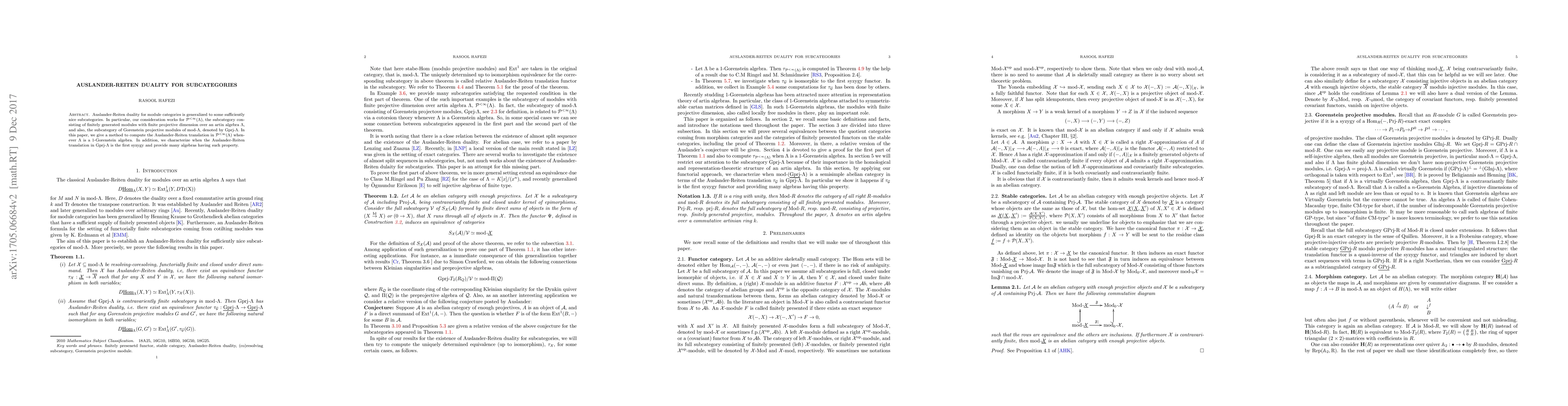 This paper generalizes Auslander-Reiten duality to subcategories, specifically focusing on $\mathcal{P}^{<\infty}(\Lambda)$ and $\rm{Gprj}\mbox{-}\Lambda$. It presents a method to compute the Auslander-Reiten translation in $\mathcal{P}^{<\infty}(\Lambda)$ for $1$-Gorenstein algebras and characterizes the conditions under which the Auslander-Reiten translation in $\rm{Gprj}\mbox{-}\Lambda$ corresponds to the first syzygy.