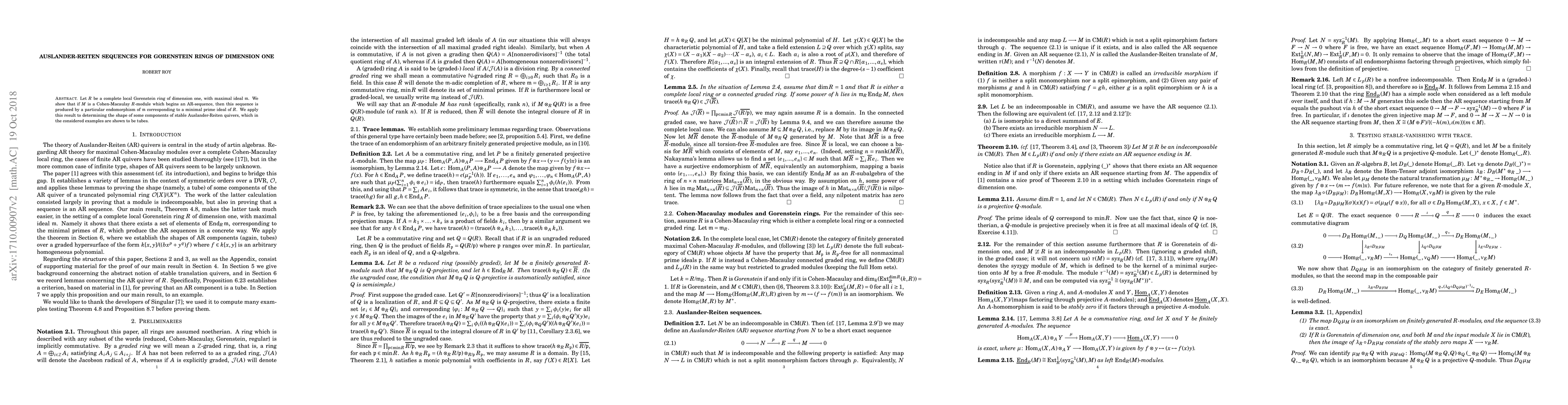 This paper demonstrates that for a complete local Gorenstein ring of dimension one, a Cohen-Macaulay module initiating an Auslander-Reiten sequence is generated by an endomorphism linked to a minimal prime ideal. The findings are applied to elucidate components of Auslander-Reiten quivers.