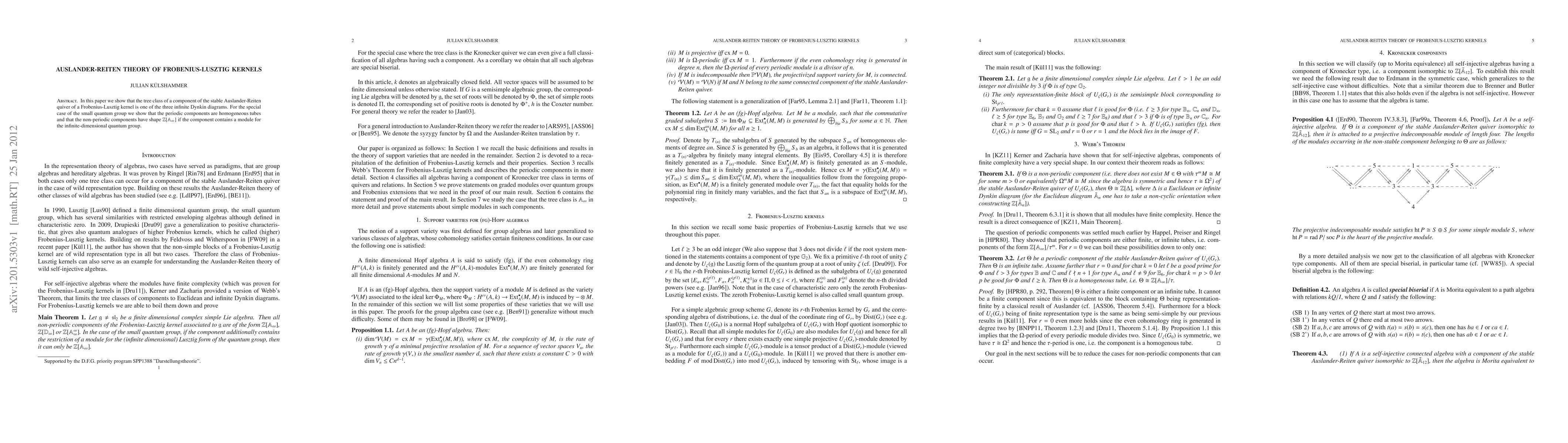 This paper demonstrates that the tree class of a component in the stable Auslander-Reiten quiver of a Frobenius-Lusztig kernel is one of the three infinite Dynkin diagrams. For the small quantum group, it shows periodic components are homogeneous tubes and non-periodic components resemble Z[A_∞] if they contain a module for the infinite-dimensional quantum group.