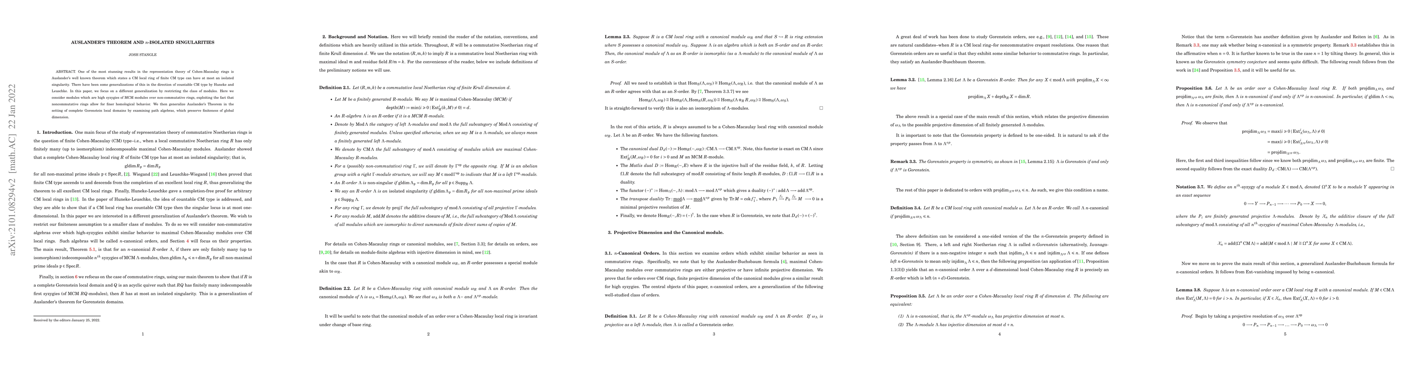 Summary: This paper generalizes Auslander's Theorem to n-isolated singularities in the context of complete Gorenstein local domains, focusing on high syzygies of MCM modules over non-commutative rings and using path algebras to maintain finite global dimension.