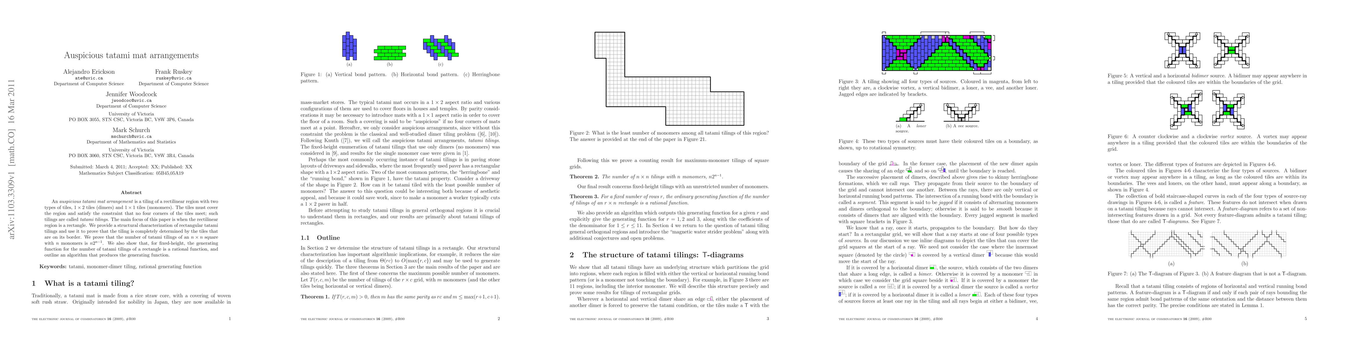 An \emph{auspicious tatami mat arrangement} is a tiling of a rectilinear region with two types of tiles, $1 \times 2$ tiles (dimers) and $1 \times 1$ tiles (monomers). The tiles must cover the region and satisfy the constraint that no four corners of the tiles meet; such tilings are called \emph{tatami tilings}. The main focus of this paper is when the rectilinear region is a rectangle. We provide a structural characterization of rectangular tatami tilings and use it to prove that the tiling is completely determined by the tiles that are on its border. We prove that the number of tatami tilings of an $n \times n$ square with $n$ monomers is $n2^{n-1}$. We also show that, for fixed-height, the generating function for the number of tatami tilings of a rectangle is a rational function, and outline an algorithm that produces the generating function.