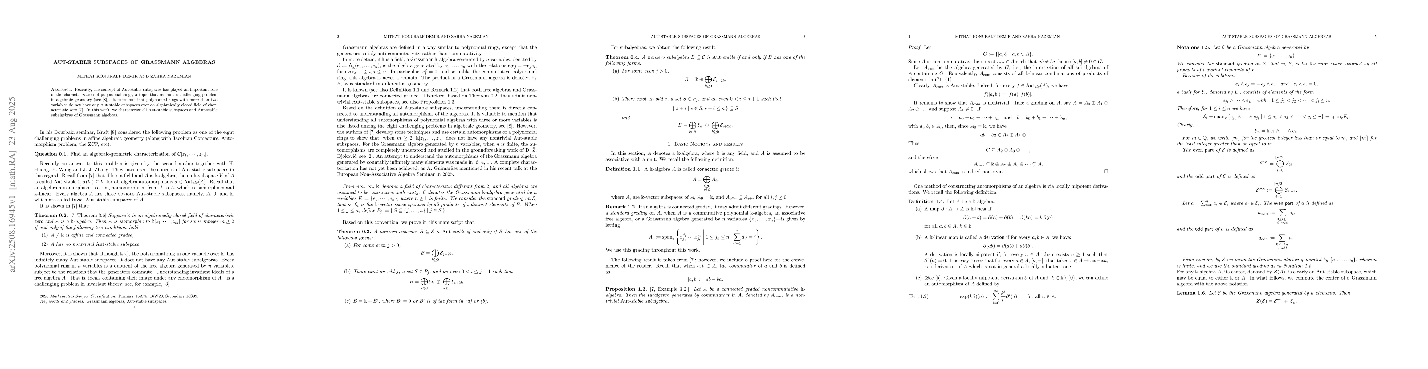 Recently, the concept of Aut-stable subspaces has played an important role in the characterization of polynomial rings, a topic that remains a challenging problem in algebraic geometry (see [8]). It turns out that polynomial rings with more than two variables do not have any Aut-stable subspaces over an algebraically closed field of characteristic zero [7]. In this work, we characterize all Aut-stable subspaces and Aut-stable subalgebras of Grassmann algebras.