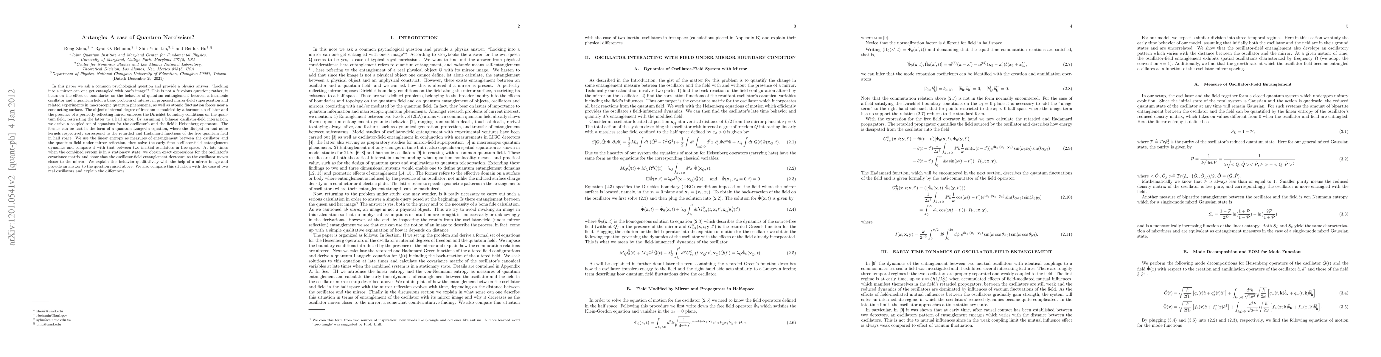 In this paper we ask a common psychological question and provide a physics answer: "Looking into a mirror can one get entangled with one's image?" This is not a frivolous question; rather, it bears on the effect of boundaries on the behavior of quantum entanglement between a harmonic oscillator and a quantum field, a basic problem of interest in proposed mirror-field superposition and related experiments in macroscopic quantum phenomena, as well as atomic fluctuation forces near a conducting surface. The object's internal degree of freedom is modeled by a harmonic oscillator and the presence of a perfectly reflecting mirror enforces the Dirichlet boundary conditions on the quantum field, restricting the latter to a half space. By assuming a bilinear oscillator-field interaction, we derive a coupled set of equations for the oscillator's and the field's Heisenberg operators. The former can be cast in the form of a quantum Langevin equation, where the dissipation and noise kernels respectively correspond to the retarded and Hadamard functions of the free quantum field in half space. We use the linear entropy as measures of entanglement between the oscillator and the quantum field under mirror reflection, then solve the early-time oscillator-field entanglement dynamics and compare it with that between two inertial oscillators in free space. At late times when the combined system is in a stationary state, we obtain exact expressions for the oscillator's covariance matrix and show that the oscillator-field entanglement decreases as the oscillator moves closer to the mirror. We explain this behavior qualitatively with the help of a mirror image and provide an answer to the question raised above. We also compare this situation with the case of two real oscillators and explain the differences.