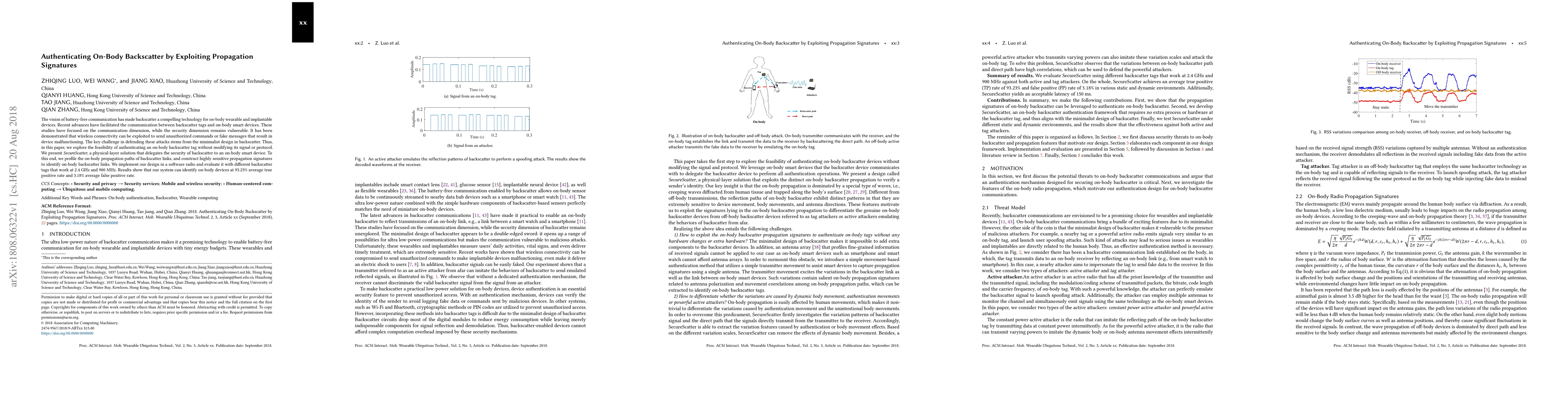 This paper proposes SecureScatter, a physical-layer authentication method for on-body backscatter communication that leverages propagation signatures to identify genuine tags without altering their signal or protocol. The system profiles propagation paths to construct sensitive signatures, achieving a 93.23% true positive rate with minimal false positives.