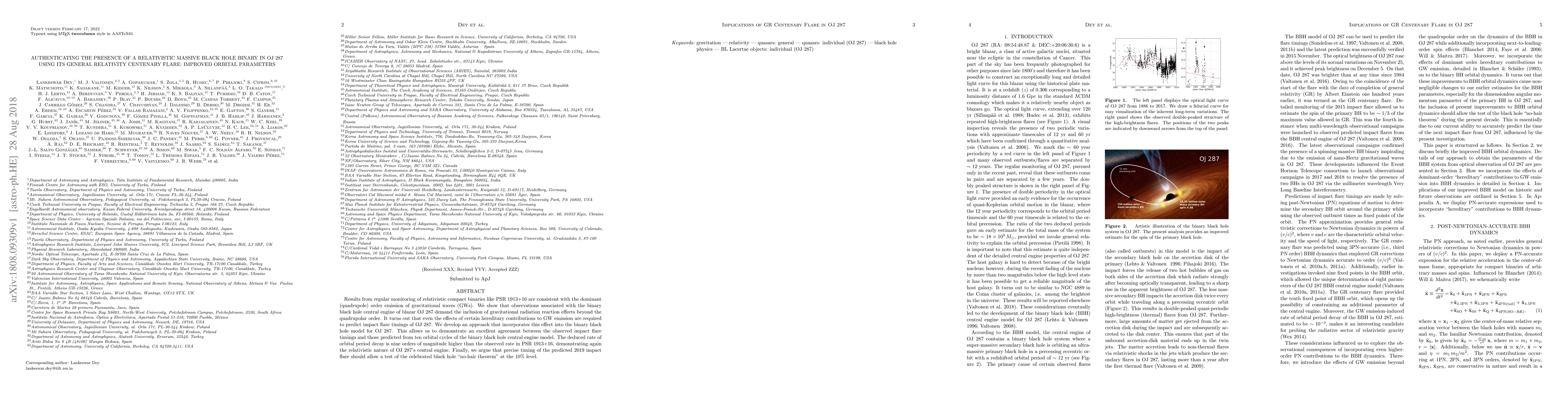 This paper authenticates the presence of a relativistic massive black hole binary in OJ 287 by incorporating gravitational radiation reaction effects beyond the quadrupolar order, achieving excellent agreement with observed flare timings. The study suggests a test of the black hole "no-hair theorem" using precise timing of the 2019 impact flare.
