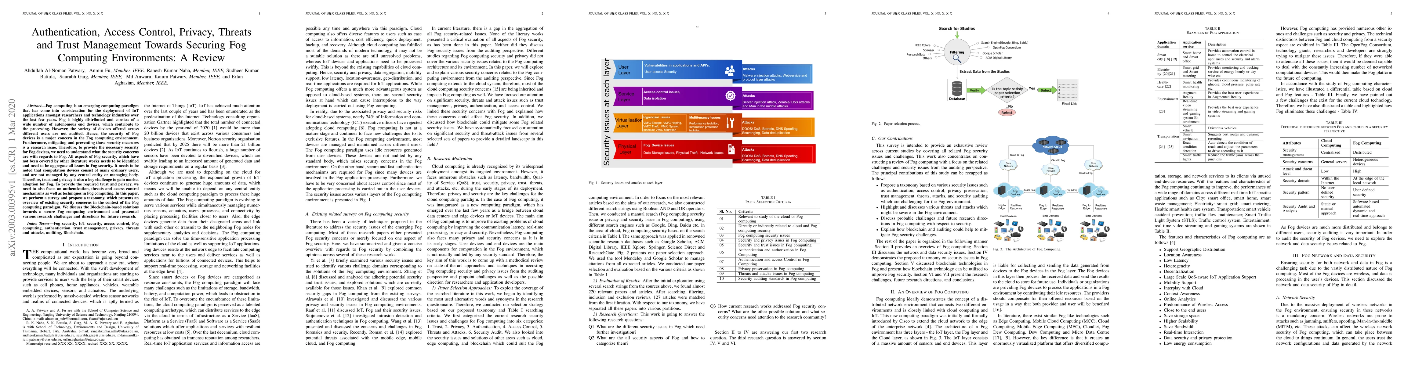 This paper reviews security concerns in Fog computing, including authentication, access control, privacy, threats, and trust management. It proposes a taxonomy to aggregate existing security issues and discusses Blockchain-based solutions for enhanced security, highlighting future research directions.