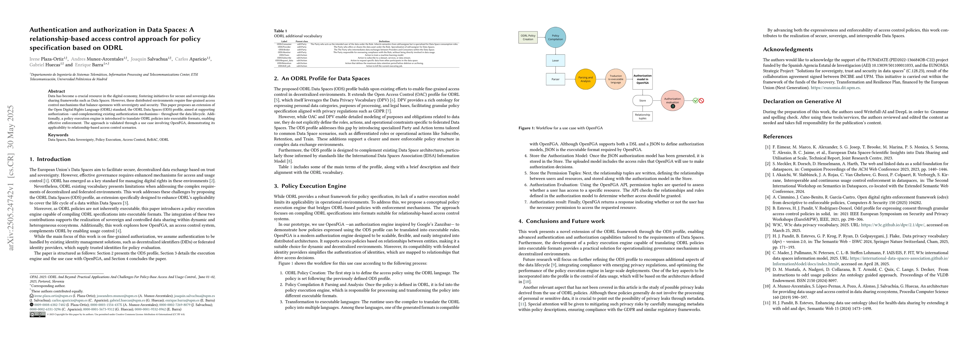A new approach to access control in Data Spaces is proposed, combining authentication and authorization based on ODRL for secure data sharing, with a policy execution engine for effective enforcement.
