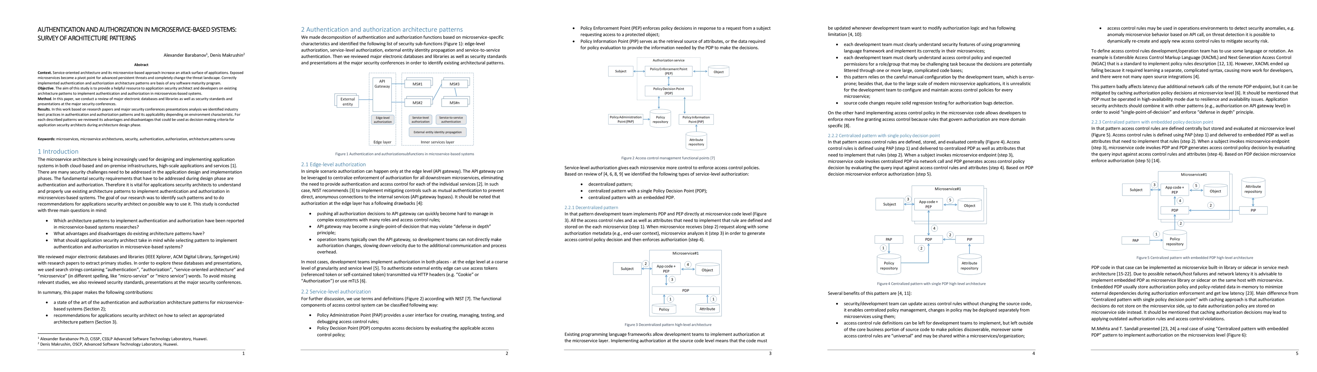 Context. Service-oriented architecture and its microservice-based approach increase an attack surface of applications. Exposed microservices become a pivot point for advanced persistent threats and completely change the threat landscape. Correctly implemented authentication and authorization architecture patterns are basis of any software maturity program. Objective. The aim of this study is to provide a helpful resource to application security architect and developers on existing architecture patterns to implement authentication and authorization in microservices-based systems. Method. In this paper, we conduct a review of major electronic databases and libraries as well as security standards and presentations at the major security conferences. Results. In this work based on research papers and major security conferences presentations analysis we identified industry best practices in authentication and authorization patterns and its applicability depending on environment characteristic. For each described patterns we reviewed its advantages and disadvantages that could be used as decision-making criteria for application security architects during architecture design phase.