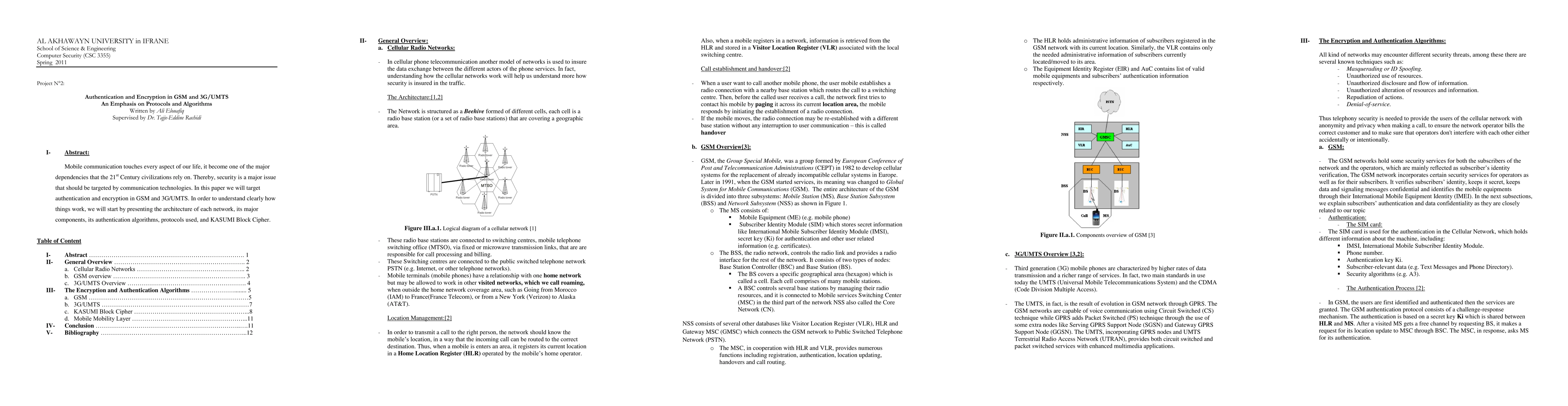 Mobile communication touches every aspect of our life, it become one of the major dependencies that the 21st Century civilizations rely on. Thereby, security is a major issue that should be targeted by communication technologies. In this paper we will target authentication and encryption in GSM and 3G/UMTS. In order to understand clearly how things work, we will start by presenting the architecture of each network, its major components, its authentication algorithms, protocols used, and KASUMI Block Cipher.