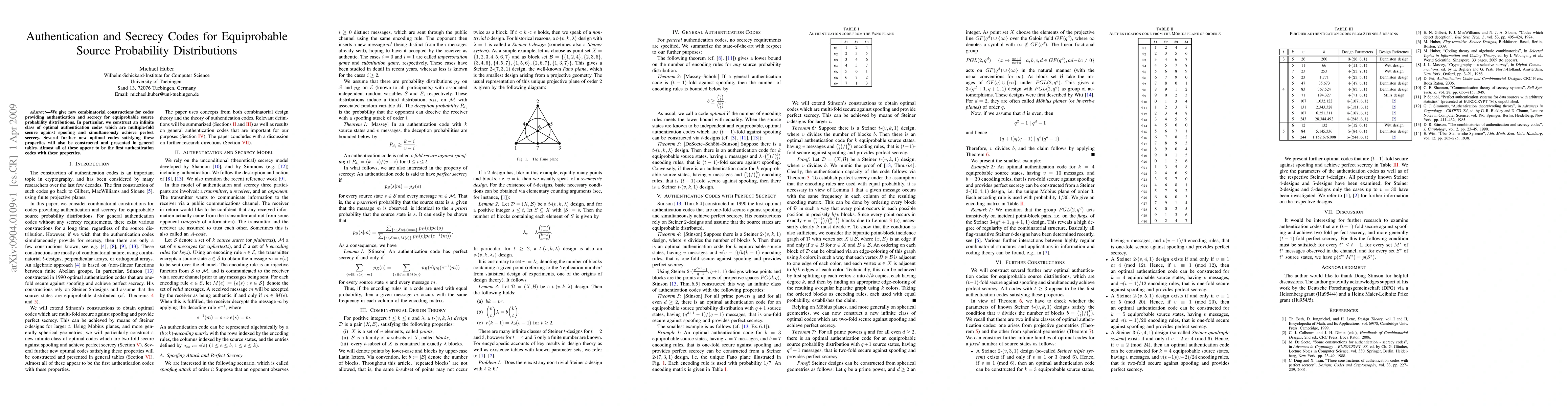 The paper introduces novel constructions of authentication and secrecy codes using combinatorial design theory, specifically Steiner systems and spherical geometries, ensuring multiple-fold security against spoofing and perfect secrecy for equiprobable source distributions.