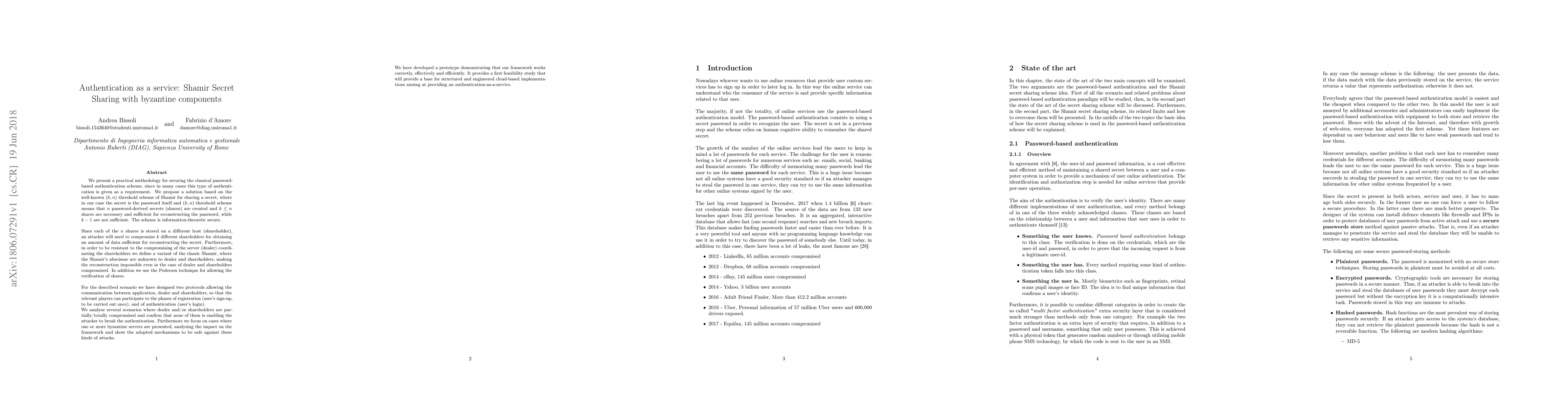 This paper proposes a secure authentication scheme using Shamir Secret Sharing to distribute password-derived shares across different hosts, ensuring that only a subset (k) is sufficient for password reconstruction. The scheme is designed to withstand attacks even if multiple shareholders or the server are compromised, employing a variant of Shamir's method where shares are verified using the Pedersen technique. The authors developed and tested protocols for registration and authentication, demonstrating the framework's resilience against various attack scenarios.