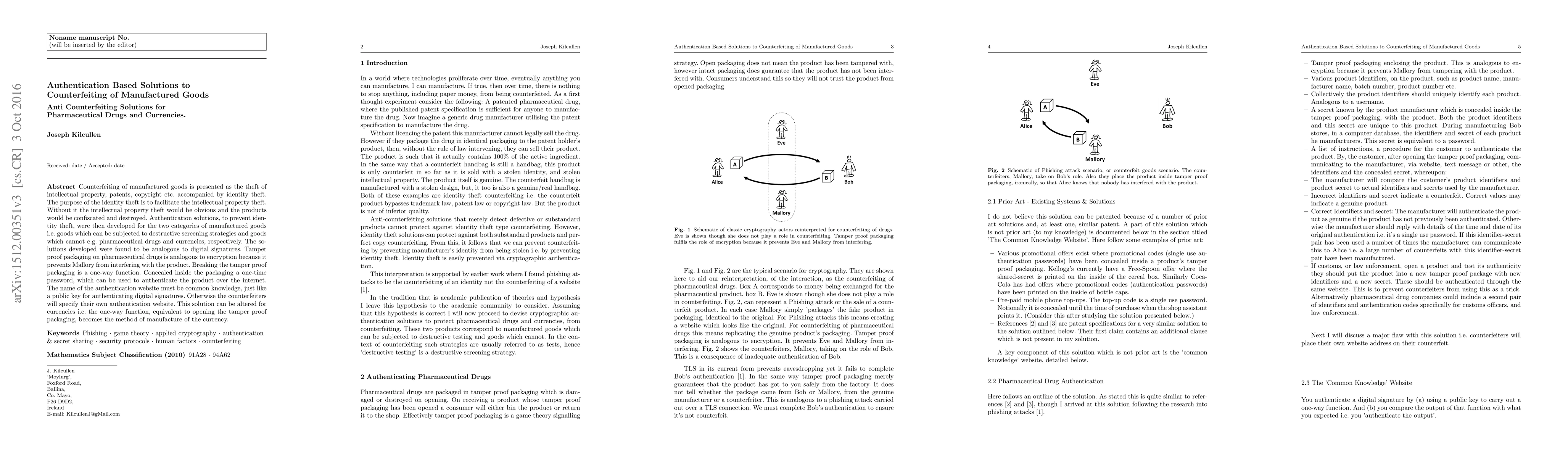Counterfeiting of manufactured goods is presented as the theft of intellectual property, patents, copyright etc. accompanied by identity theft. The purpose of the identity theft is to facilitate the intellectual property theft. Without it the intellectual property theft would be obvious and the products would be confiscated and destroyed. Authentication solutions, to prevent identity theft, were then developed for the two categories of manufactured goods i.e. goods which can be subjected to destructive screening strategies and goods which cannot e.g. pharmaceutical drugs and currencies, respectively. The solutions developed were found to be analogous to digital signatures. Tamper proof packaging on pharmaceutical drugs is analogous to encryption because it prevents Mallory from interfering with the product. Breaking the tamper proof packaging is a one-way function. Concealed inside the packaging a one-time password, which can be used to authenticate the product over the internet. The name of the authentication website must be common knowledge, just like a public key for authenticating digital signatures. Otherwise the counterfeiters will specify their own authentication website. This solution can be altered for currencies i.e. the one-way function, equivalent to opening the tamper proof packaging, becomes the method of manufacture of the currency.