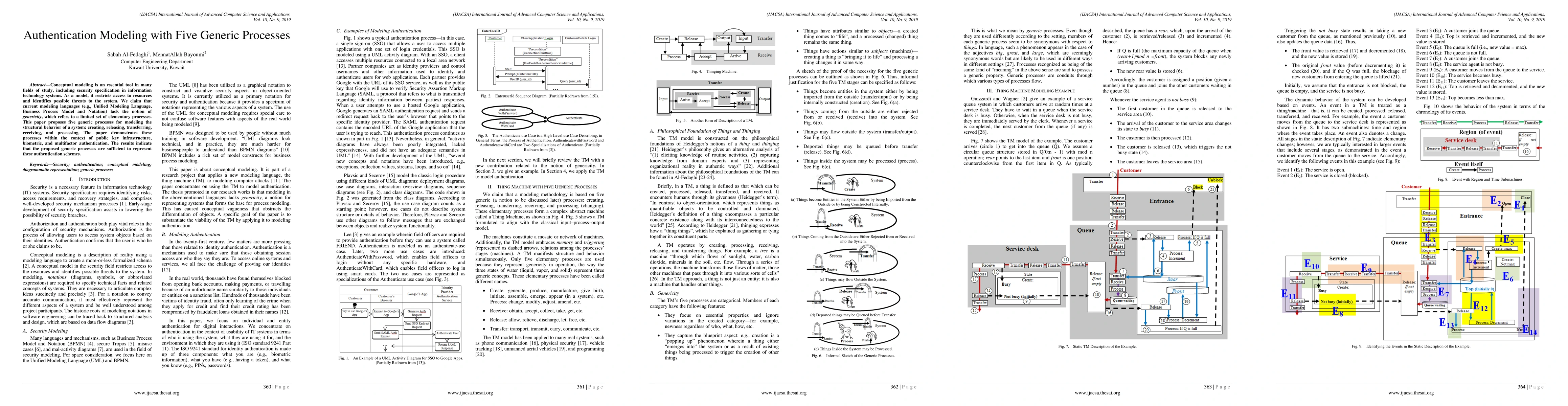Conceptual modeling is an essential tool in many fields of study, including security specification in information technology systems. As a model, it restricts access to resources and identifies possible threats to the system. We claim that current modeling languages (e.g., Unified Modeling Language, Business Process Model and Notation) lack the notion of genericity, which refers to a limited set of elementary processes. This paper proposes five generic processes for modeling the structural behavior of a system: creating, releasing, transferring, receiving, and processing. The paper demonstrates these processes within the context of public key infrastructure, biometric, and multifactor authentication. The results indicate that the proposed generic processes are sufficient to represent these authentication schemes.
