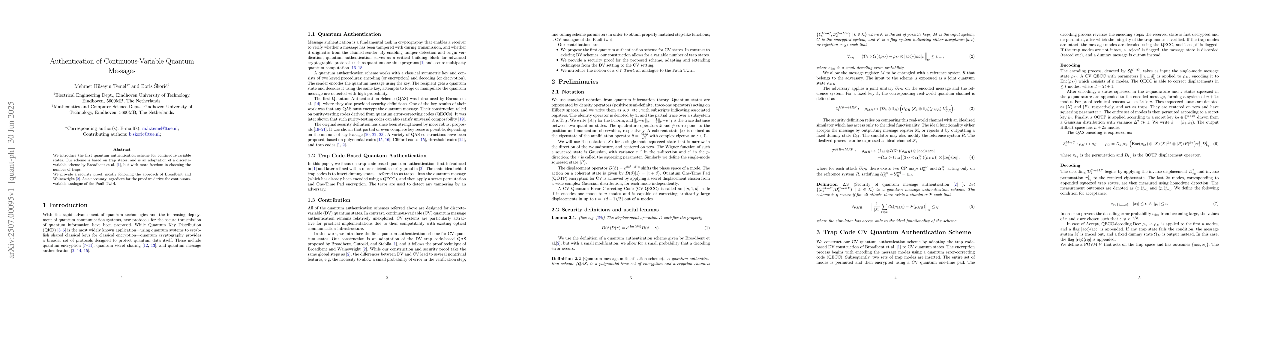 We introduce the first quantum authentication scheme for continuous-variable states. Our scheme is based on trap states, and is an adaptation of a discrete-variable scheme by Broadbent et al. (arXiv:1211.1080), but with more freedom in choosing the number of traps. We provide a security proof, mostly following the approach of Broadbent and Wainewright (arXiv:1607.03075). As a necessary ingredient for the proof we derive the continuous-variable analogue of the Pauli Twirl.