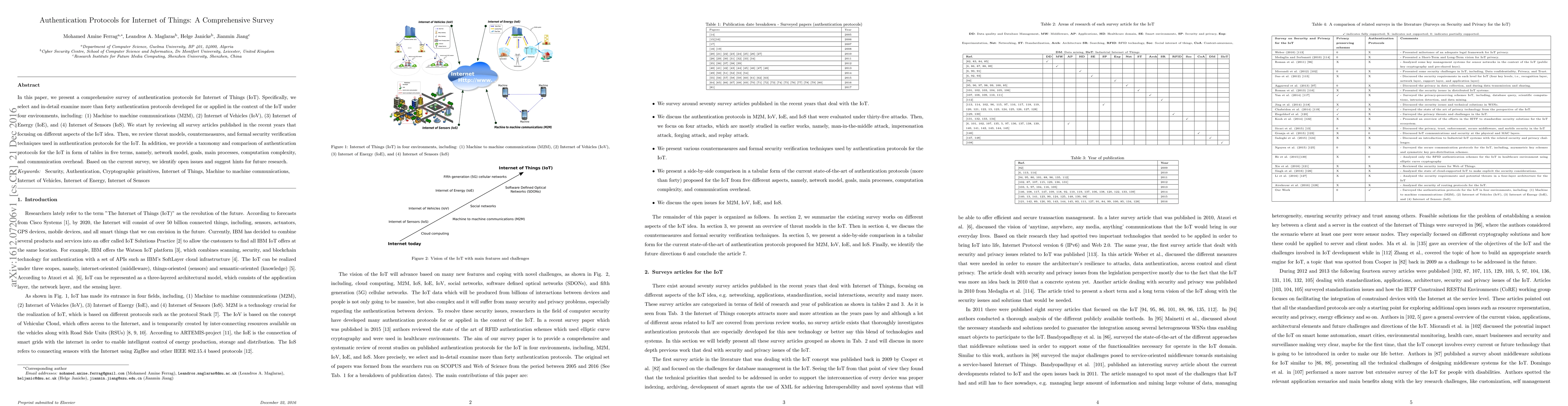 This paper provides a comprehensive survey of over forty IoT authentication protocols, categorizing them across four environments: M2M, IoV, IoE, and IoS. It reviews threat models, countermeasures, and formal verification techniques, and offers a taxonomy comparing protocols based on network model, goals, processes, complexity, and overhead, while identifying open issues and suggesting future research directions.