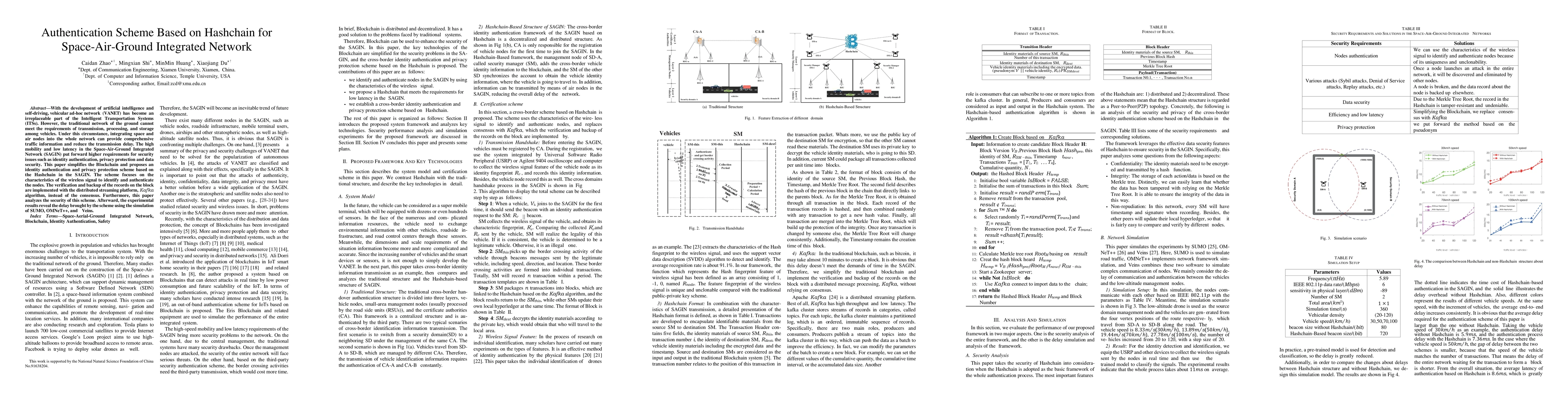 This paper presents an authentication scheme based on Hashchain for the Space-Air-Ground Integrated Network (SAGIN), addressing security challenges in high mobility environments. It leverages wireless signal characteristics for node identification and uses Kafka for record verification, demonstrating improved security and reduced latency through simulations.