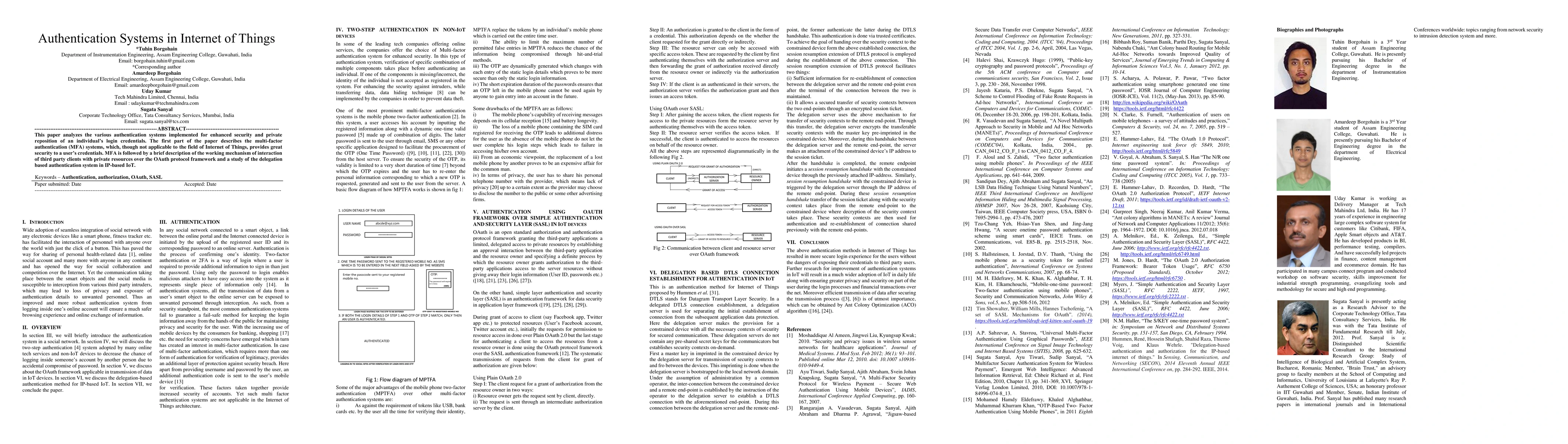 This paper analyses the various authentication systems implemented for enhanced security and private re-position of an individual's log-in credentials. The first part of the paper describes the multi-factor authentication (MFA) systems, which, though not applicable to the field of Internet of Things, provides great security to a user's credentials. MFA is followed by a brief description of the working mechanism of interaction of third party clients with private resources over the OAuth protocol framework and a study of the delegation based authentication system in IP-based IoT.