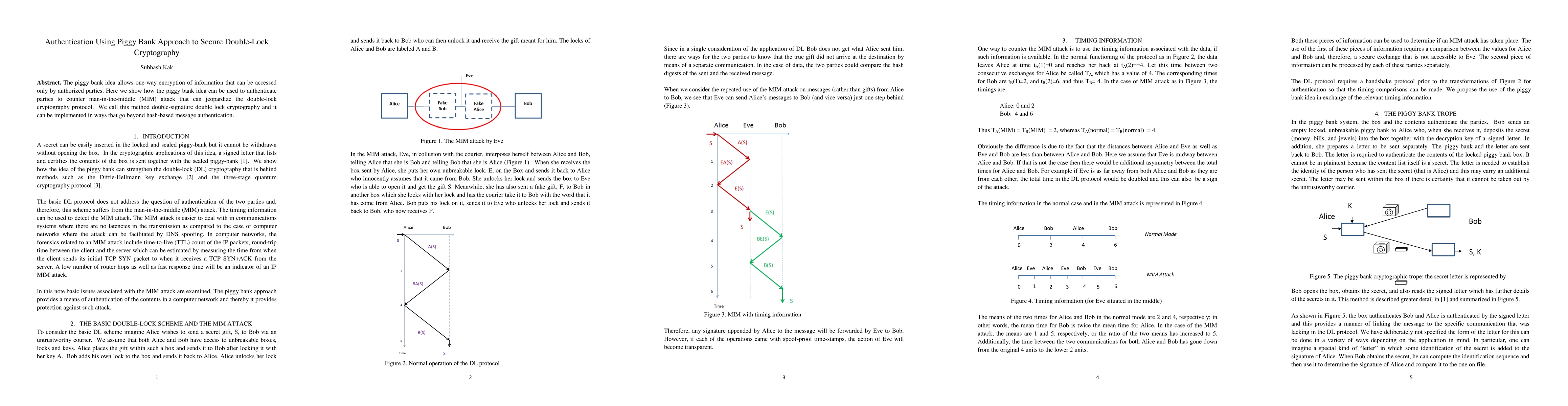 This paper proposes a piggy bank approach to enhance double-lock cryptography by using one-way encryption for authentication, countering man-in-the-middle attacks, and introducing a double-signature double lock cryptography method beyond traditional hash-based message authentication.