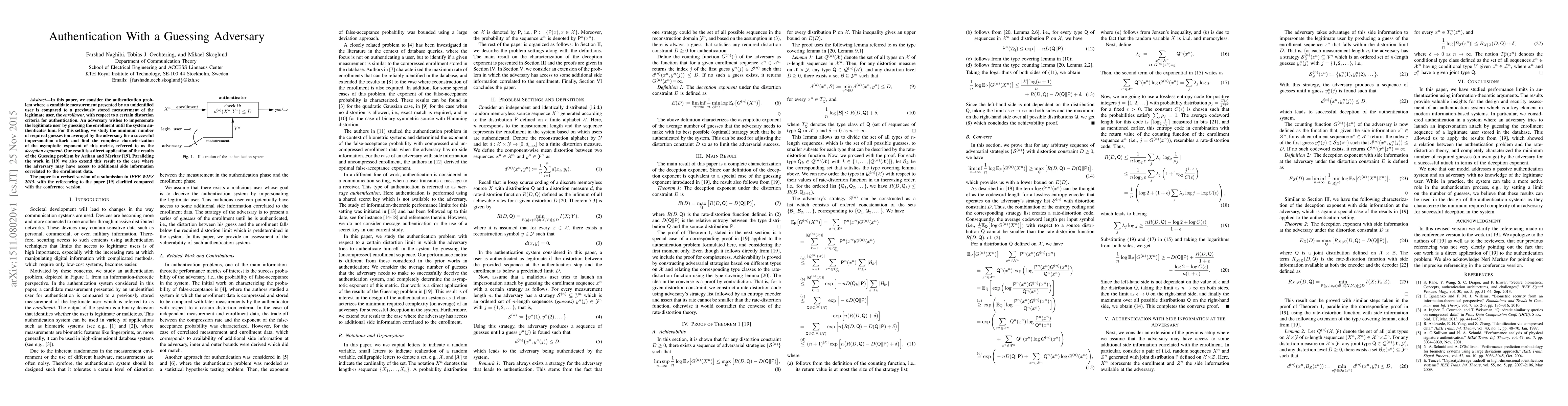 In this paper, we consider the authentication problem where a candidate measurement presented by an unidentified user is compared to a previously stored measurement of the legitimate user, the enrollment, with respect to a certain distortion criteria for authentication. An adversary wishes to impersonate the legitimate user by guessing the enrollment until the system authenticates him. For this setting, we study the minimum number of required guesses (on average) by the adversary for a successful impersonation attack and find the complete characterization of the asymptotic exponent of this metric, referred to as the deception exponent. Our result is a direct application of the results of the Guessing problem by Arikan and Merhav [19]. Paralleling the work in [19] we also extend this result to the case where the adversary may have access to additional side information correlated to the enrollment data. The paper is a revised version of a submission to IEEE WIFS 2015, with the referencing to the paper [19] clarified compared with the conference version.