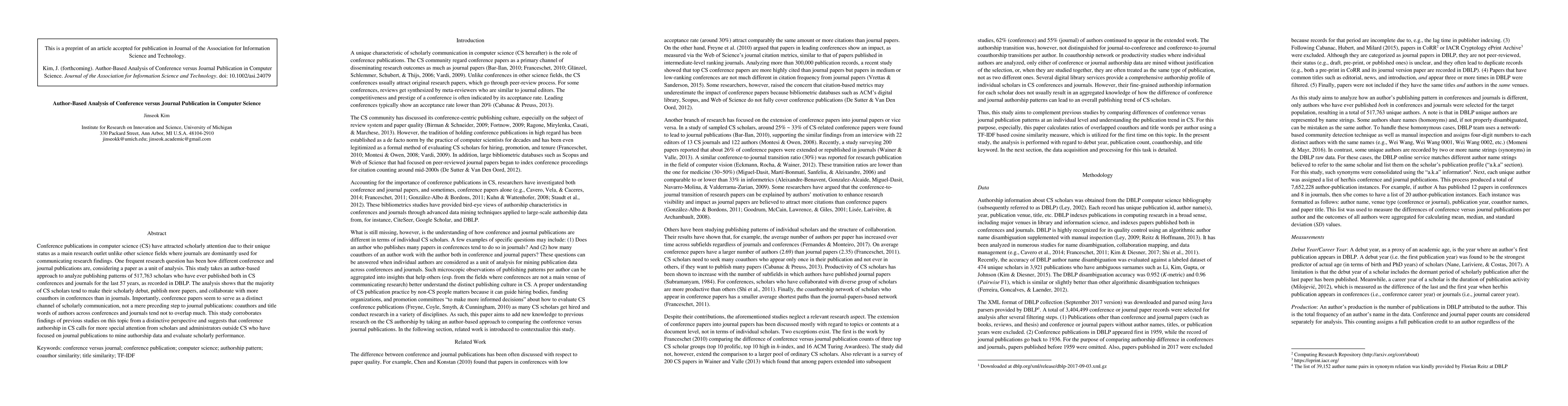 This study analyzes the publishing patterns of 517,763 computer science scholars who have published in both conferences and journals, revealing that conferences serve as a distinct channel for scholarly communication, with different coauthors and topics compared to journals. The findings suggest that conference publications in CS deserve more attention from non-CS scholars evaluating academic performance.