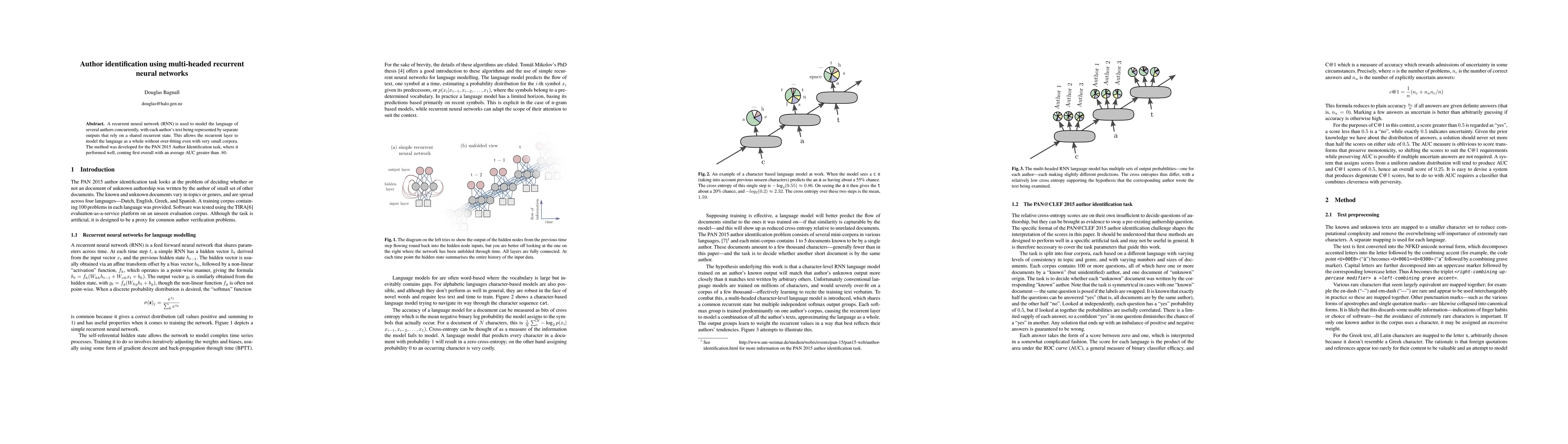 This paper proposes a multi-headed recurrent neural network for author identification, splitting the output layer into sub-models for each author while sharing the recurrent layer. This approach effectively models language without overfitting, leading to competitive performance and first-place rankings in two languages in the PAN 2015 Author Identification task.