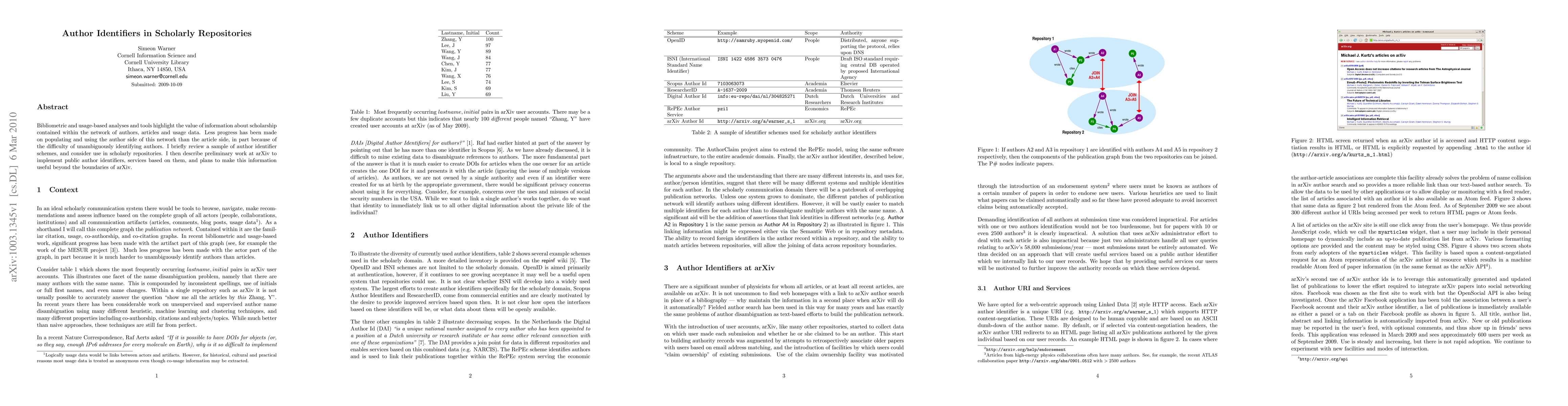 A study explores ways to improve the identification of authors in scholarly repositories, highlighting a need for more robust author identifier schemes. Preliminary work shows promise in implementing public author identifiers on arXiv, with plans to expand their use beyond the platform.